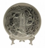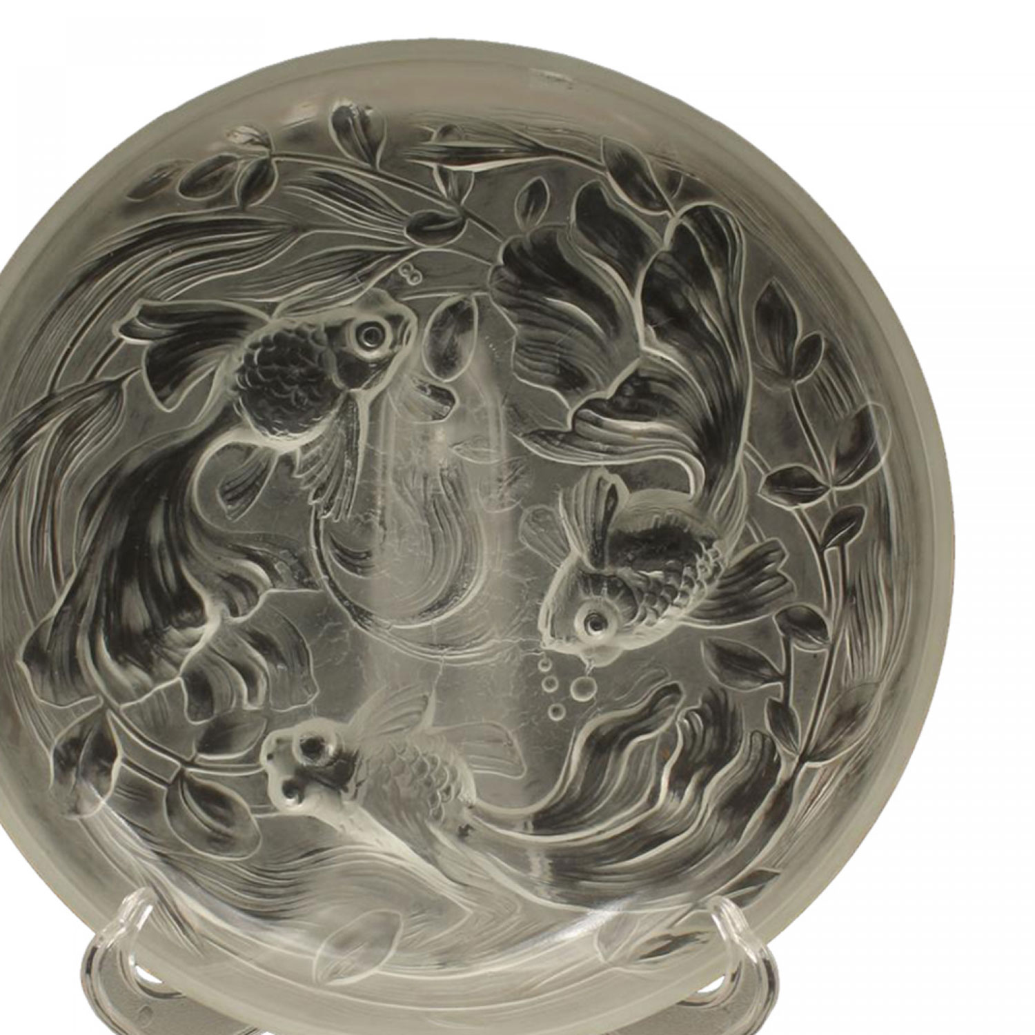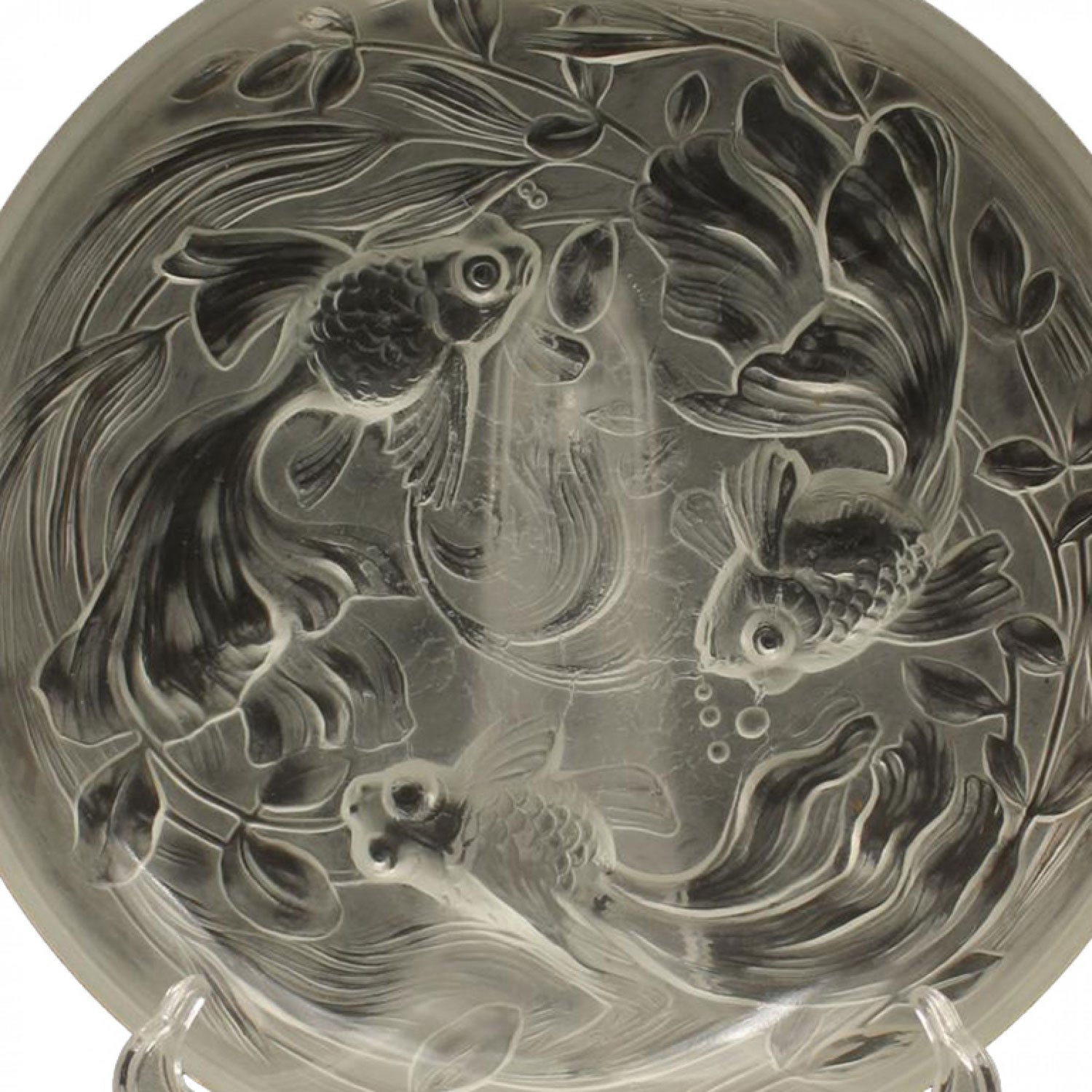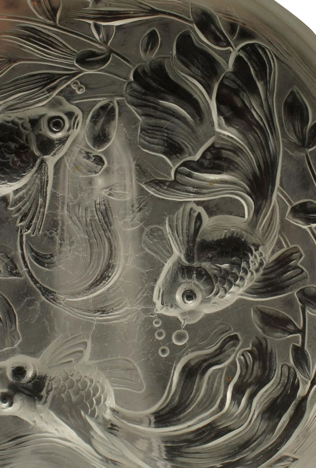 French Art Deco frosted glass round bowl with 3 fish in relief with floral design..