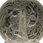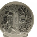 French Art Deco frosted glass round bowl with 3 fish in relief with floral design.