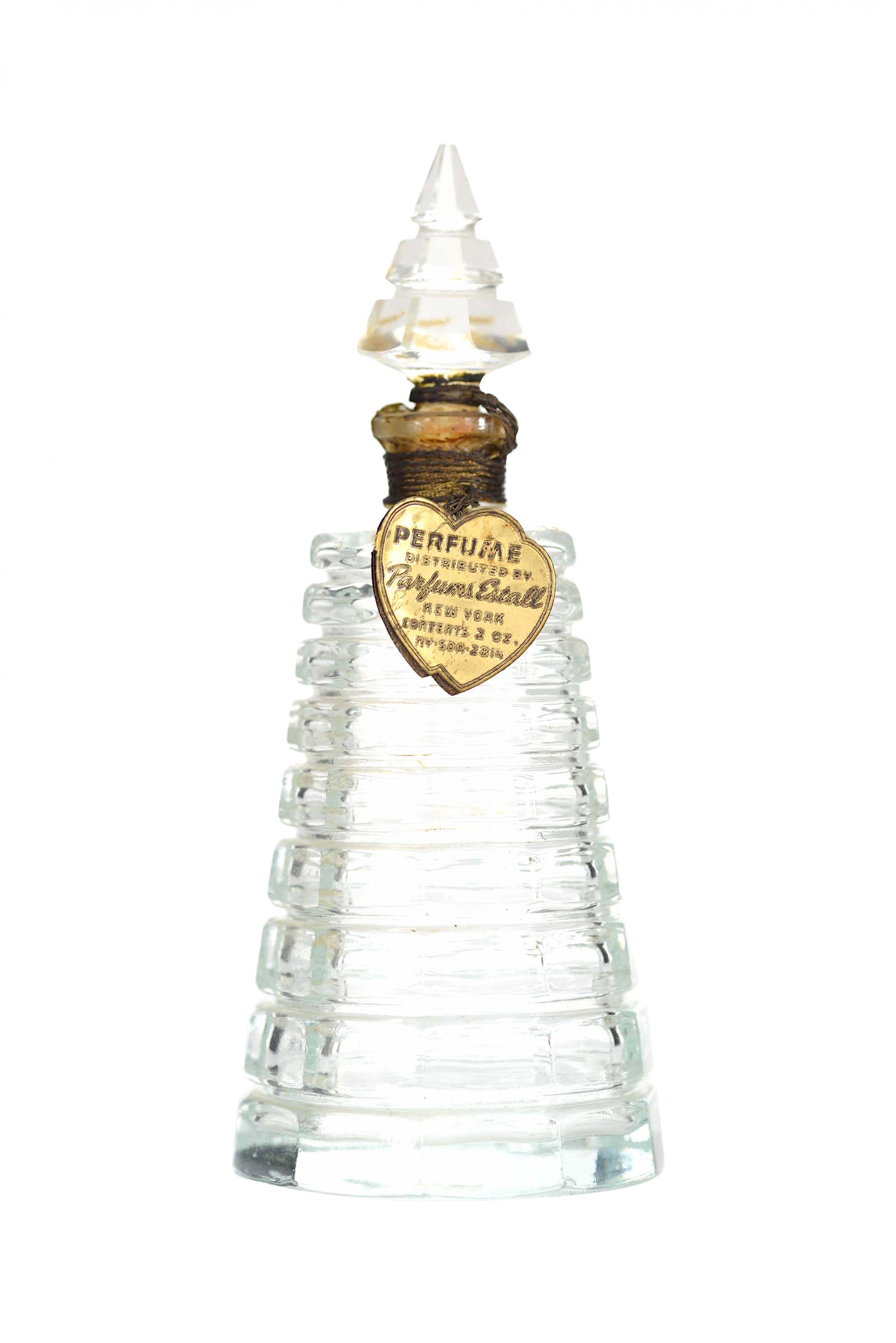 French Art Deco cone-shaped clear glass perfume bottle with horizontal ribbing, a gold heart-shaped label and a matching stopper..