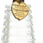 French Art Deco cone-shaped clear glass perfume bottle with horizontal ribbing, a gold heart-shaped label and a matching stopper.