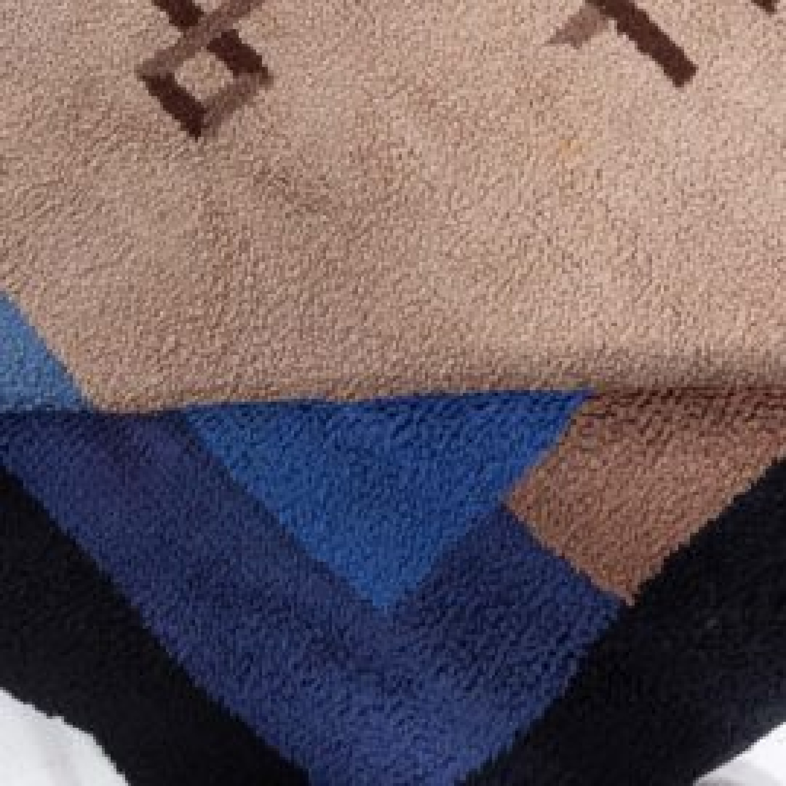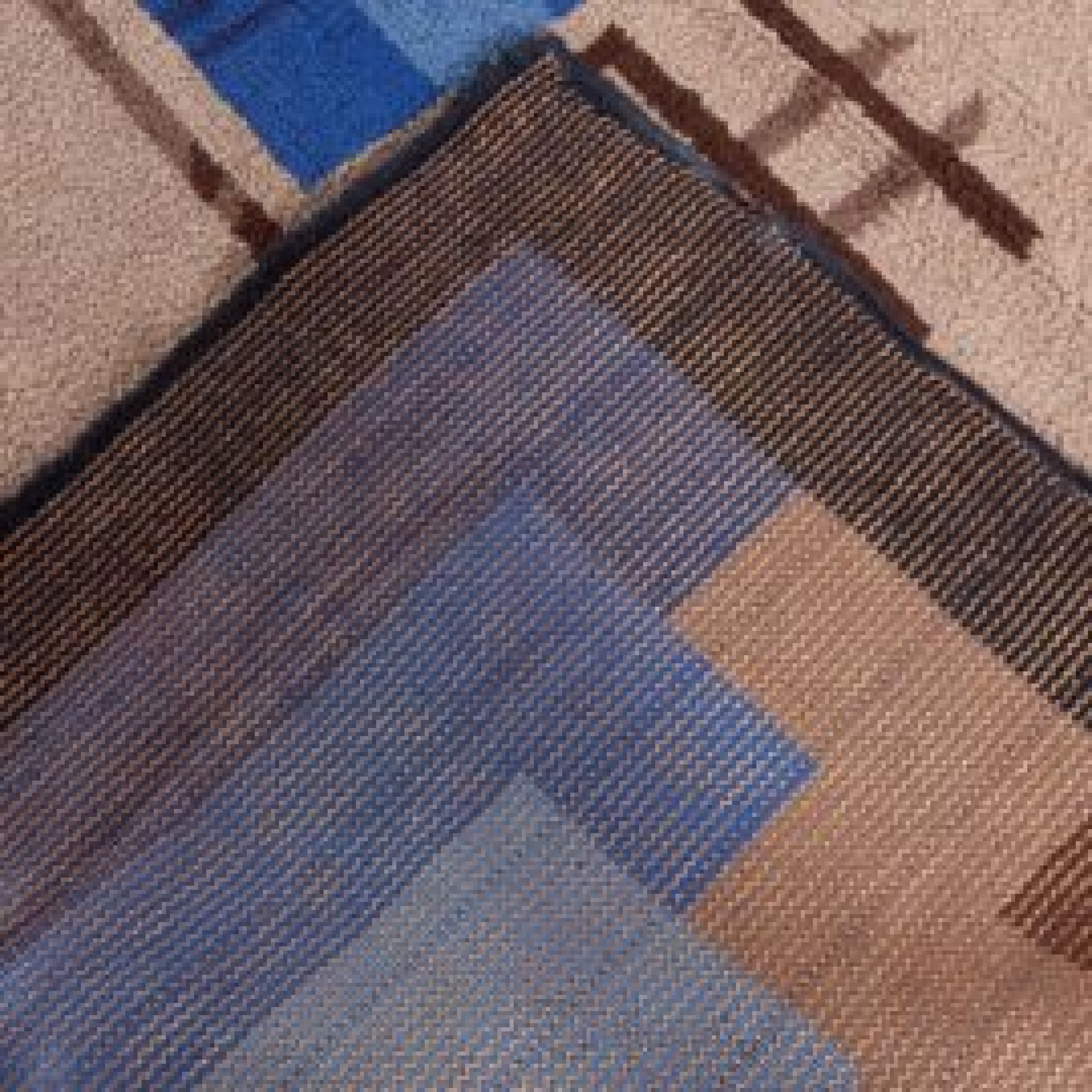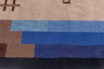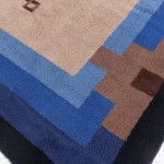 French Art Deco wool rug featuring woven geometric and linear designs in shades of blue, brown and black.