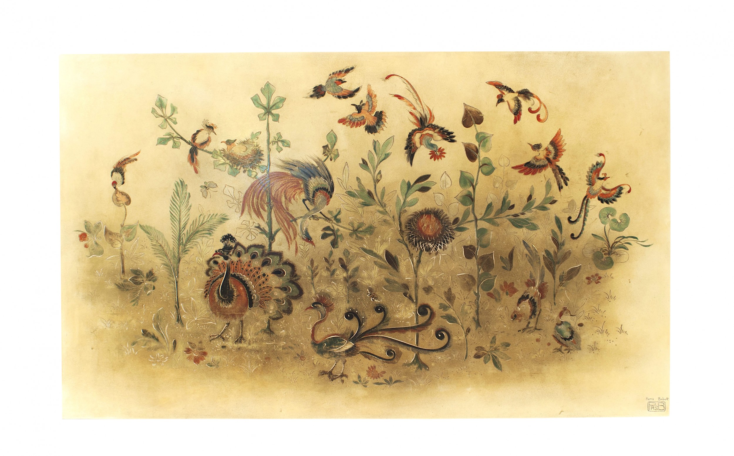 French Art Deco (1930s) large cream and gold lacquered painted stucco on wood wall panel depicting birds within a floral design. (signed: PIERRE BOBOT).
