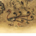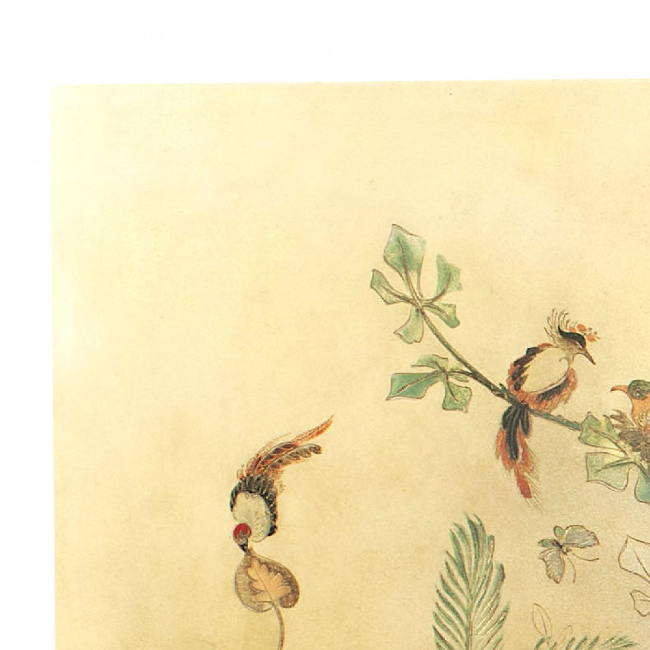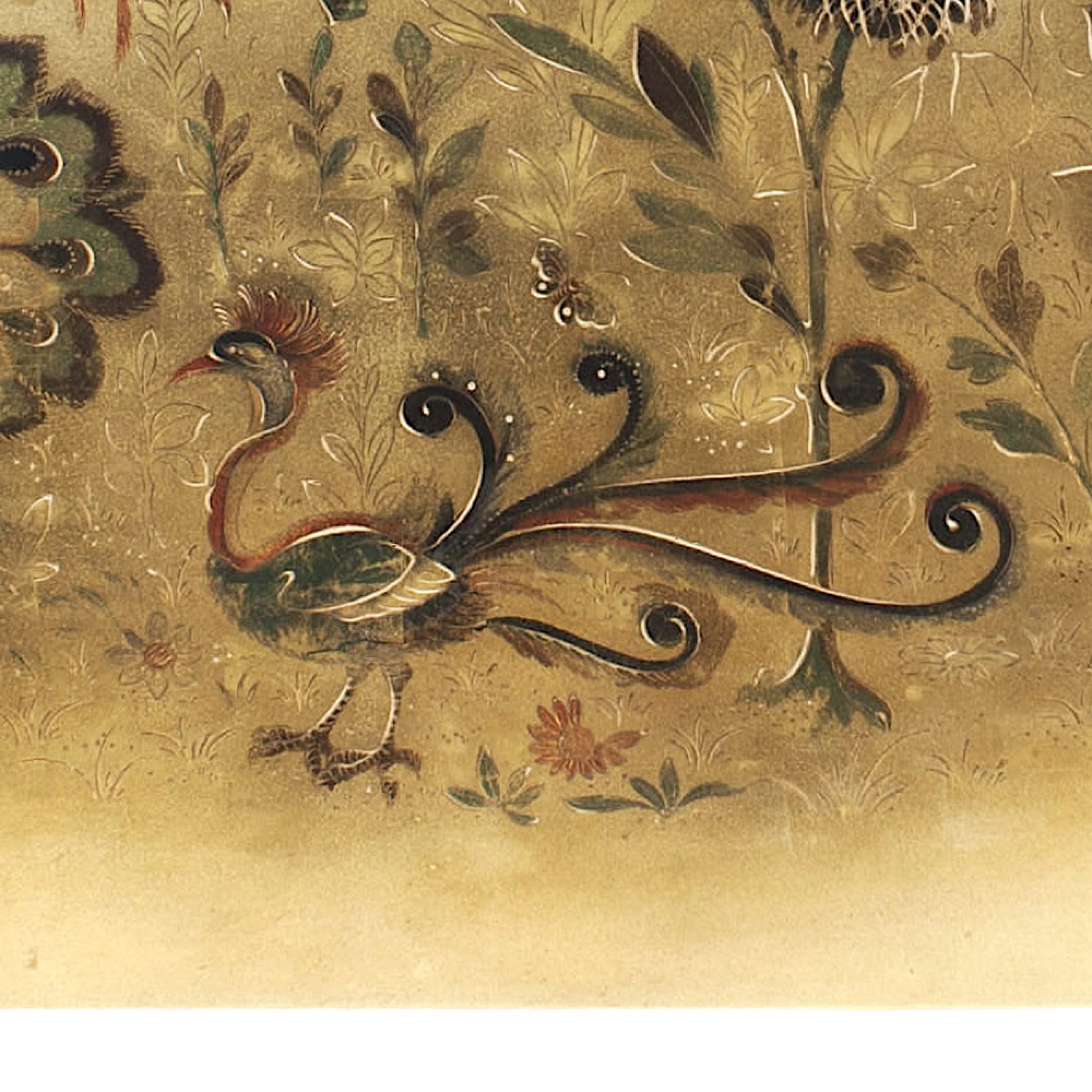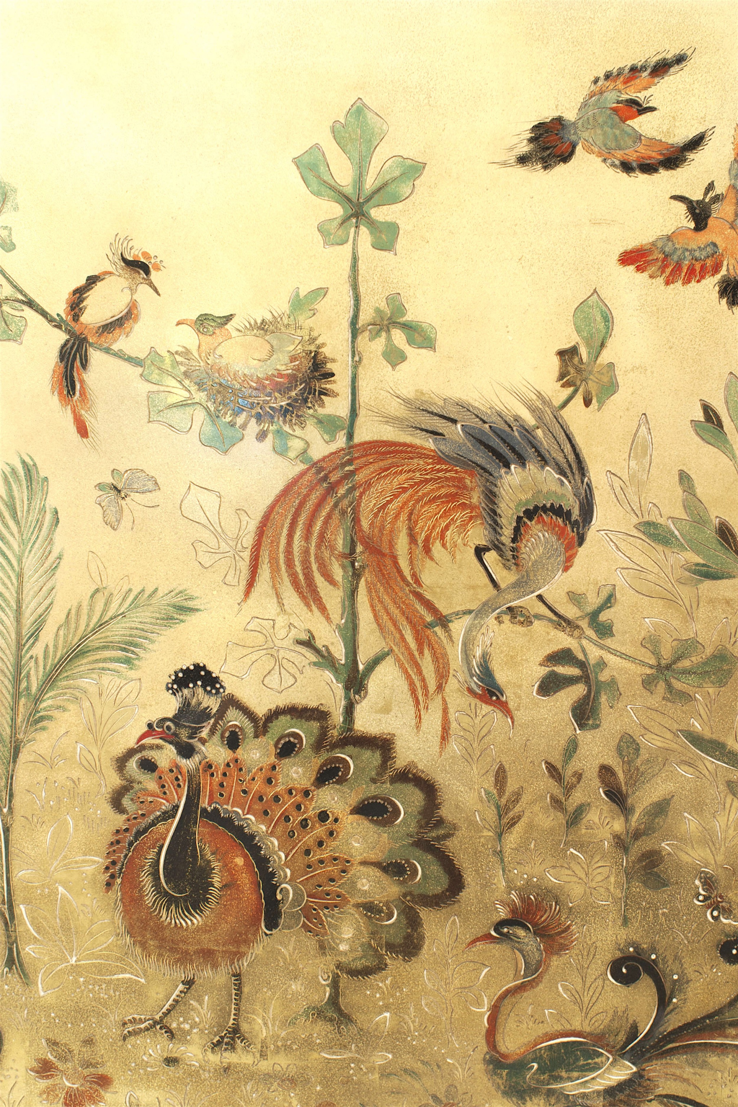 French Art Deco (1930s) large cream and gold lacquered painted stucco on wood wall panel depicting birds within a floral design. (signed: PIERRE BOBOT)