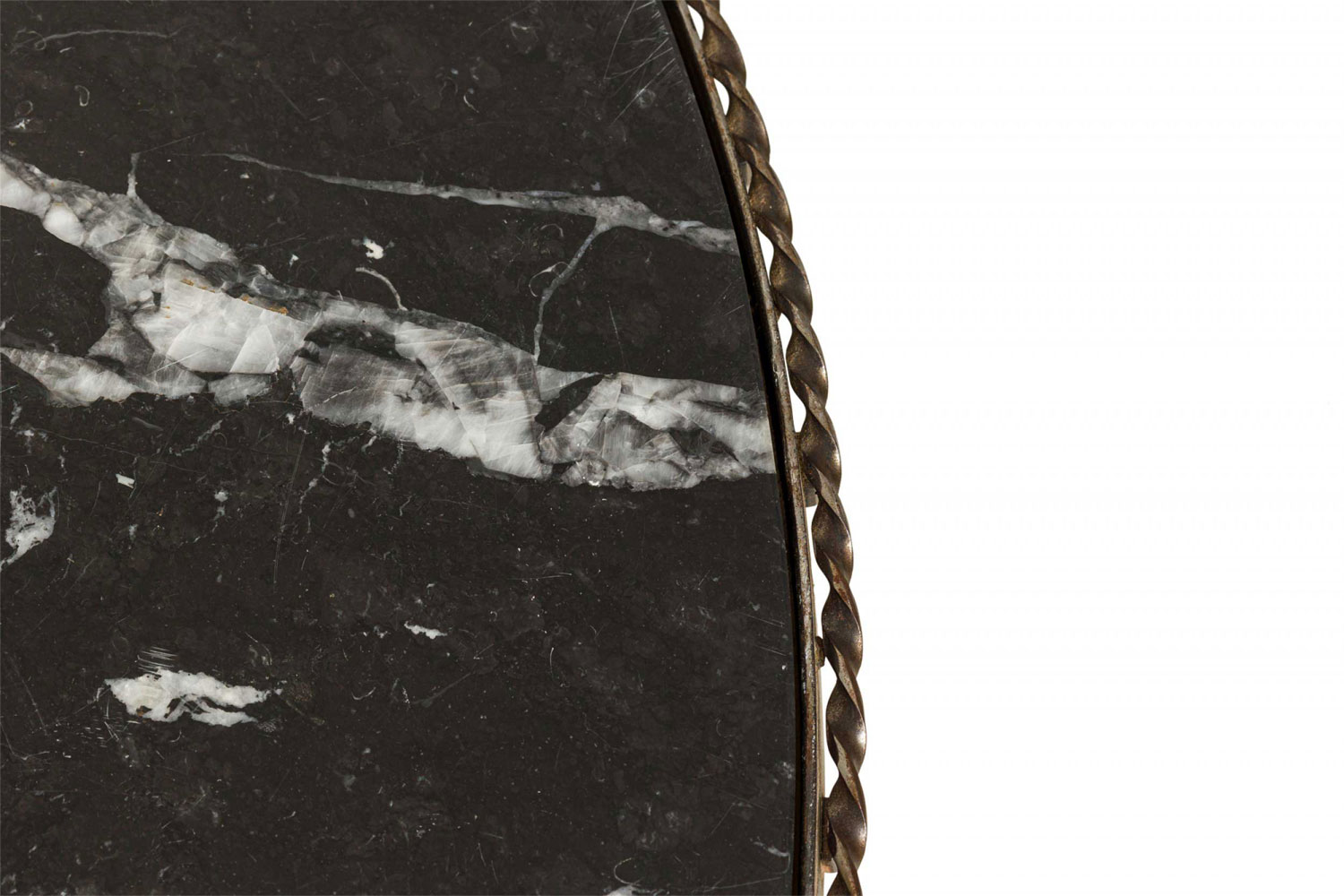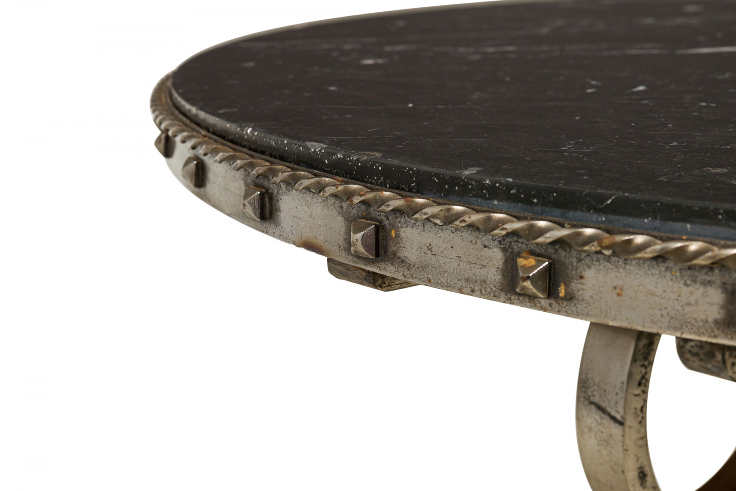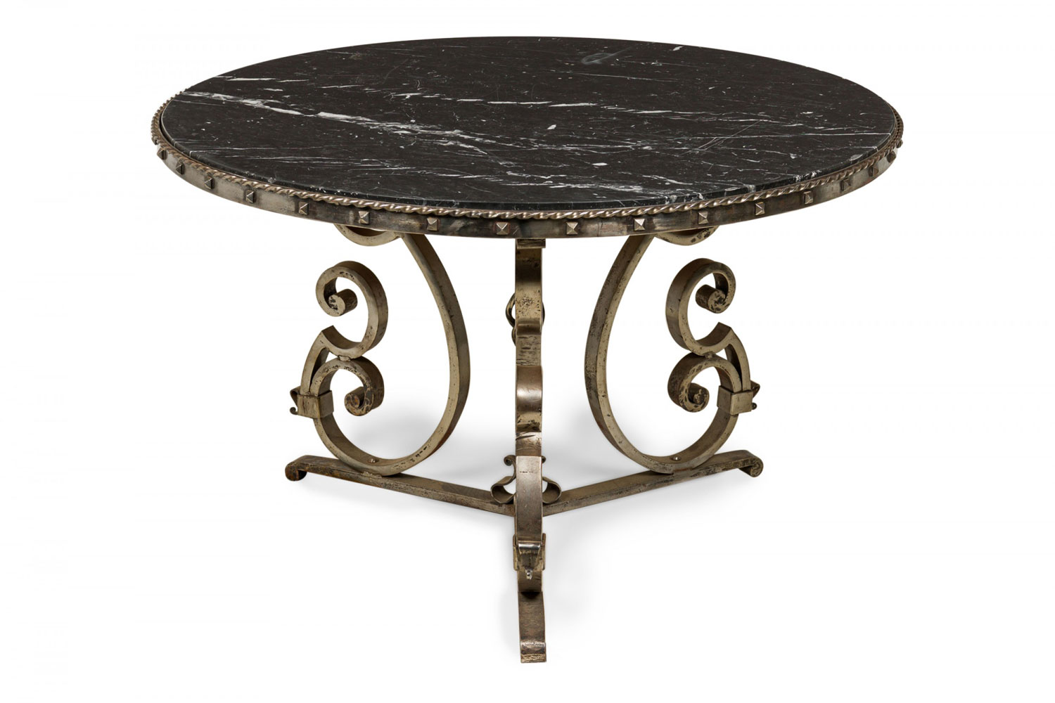 French Art Deco center table with a scroll form iron pedestal base with rope design trim and base finial and square iron studs around the tabletop frame, supporting a thick circular black marble top. (manner of RAYMOND SUBES).
