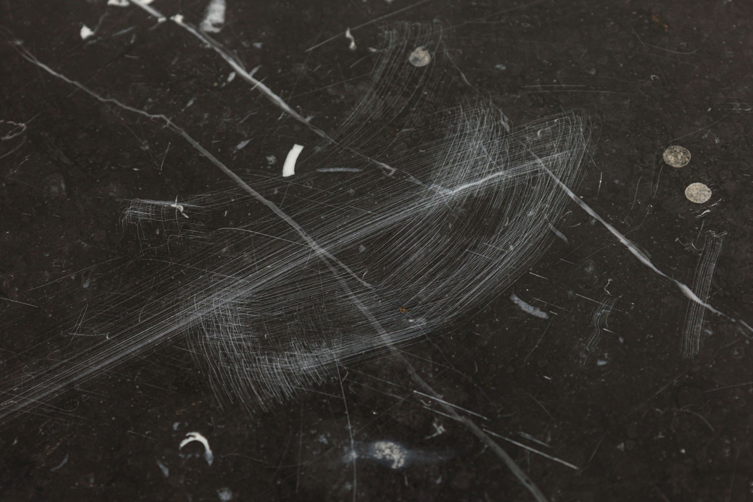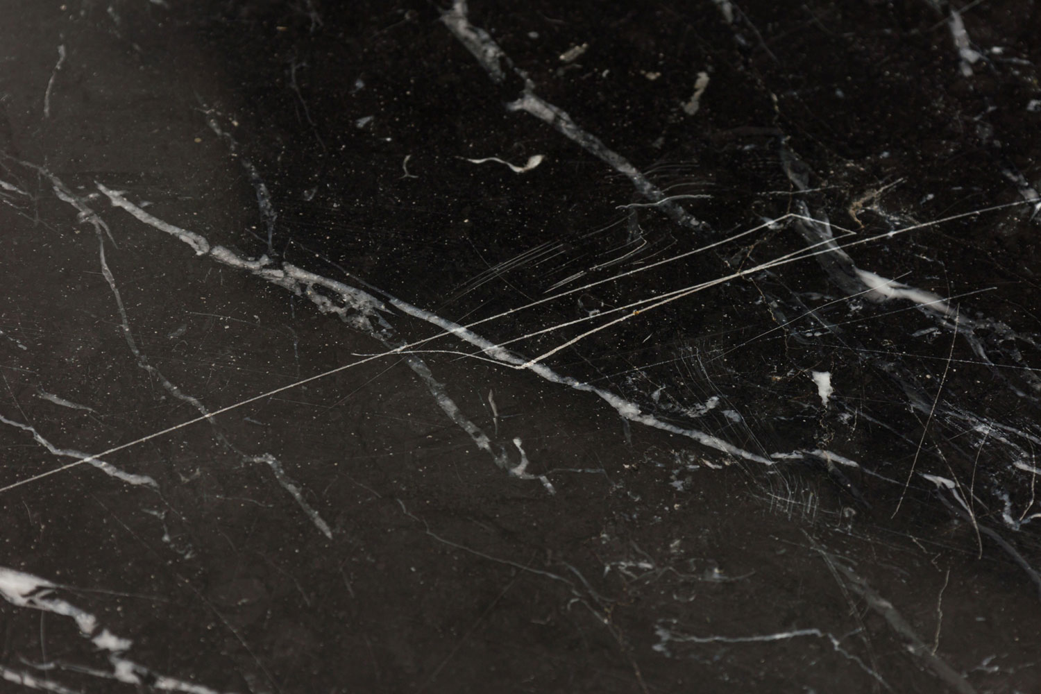 Style: Art Deco Materials & Techniques: Iron, marble Category: Tables Condition: Minor tarnishing to base, some scratching and chipping to marble top. Good; Wear consistent with age and use