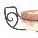 French Art Deco compote with a mauve, green, pink, and white frosted glass round bowl in a wrought iron stand with a triangular base and two scrolled handles (signed, DEGUE).