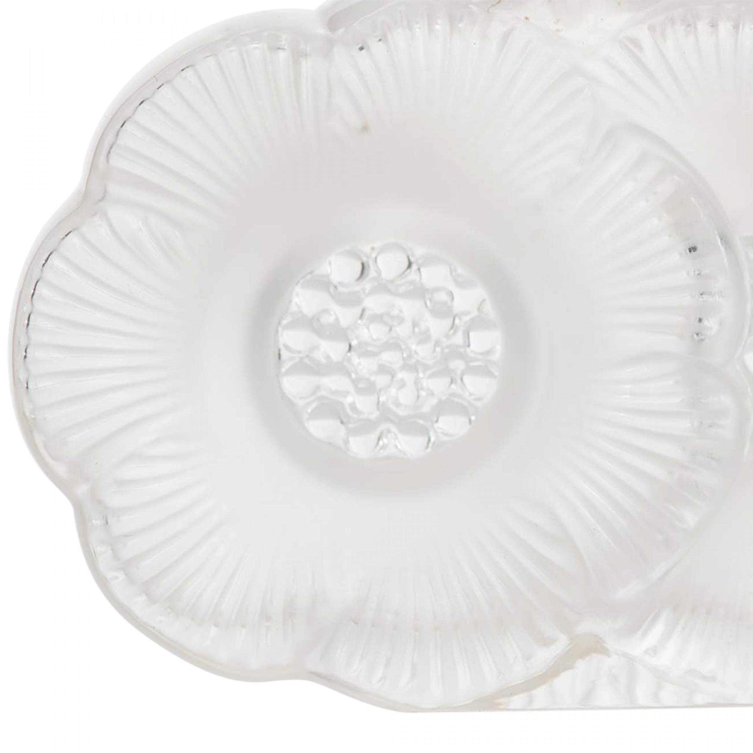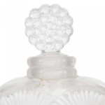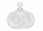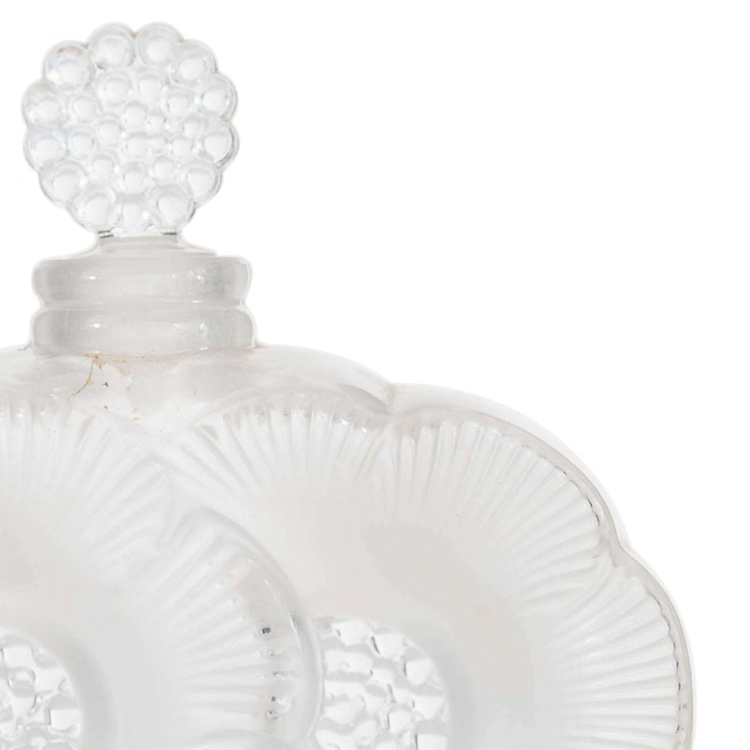 French Art Deco clear and frosted glass perfume bottle in the form of two overlapping flower heads and a stopper matching the flower centers (signed LALIQUE).