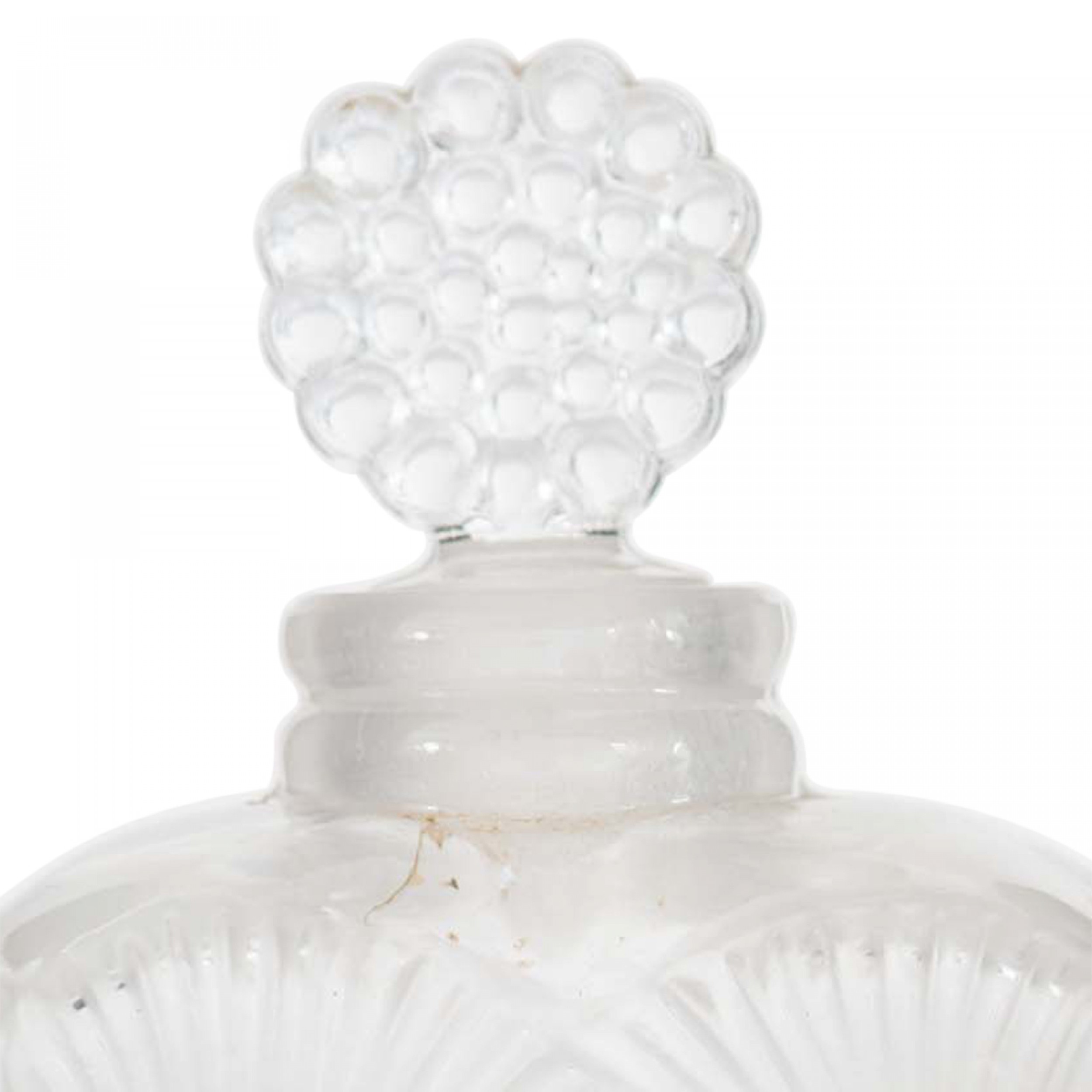 French Art Deco clear and frosted glass perfume bottle in the form of two overlapping flower heads and a stopper matching the flower centers (signed LALIQUE)
