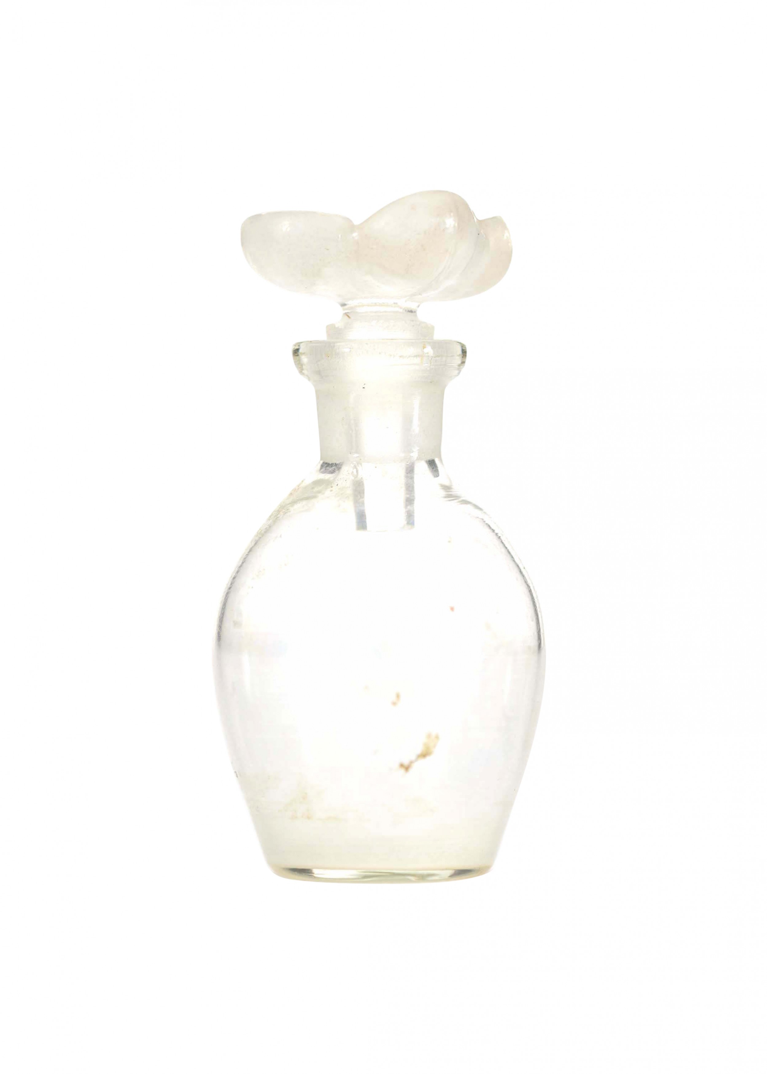 French Art Deco small clear glass perfume bottle (LE LYS by D'ORSAY) with a flower-shaped stopper, embossed with perfume name..