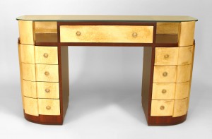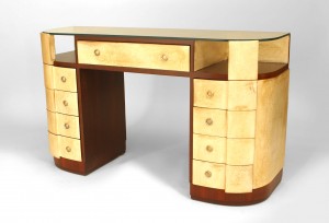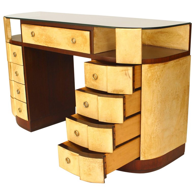 French Art Deco mahogany and parchment veneered "D" shaped dressing table desk with a glass top over sides of an open shelf and 4 drawers.
