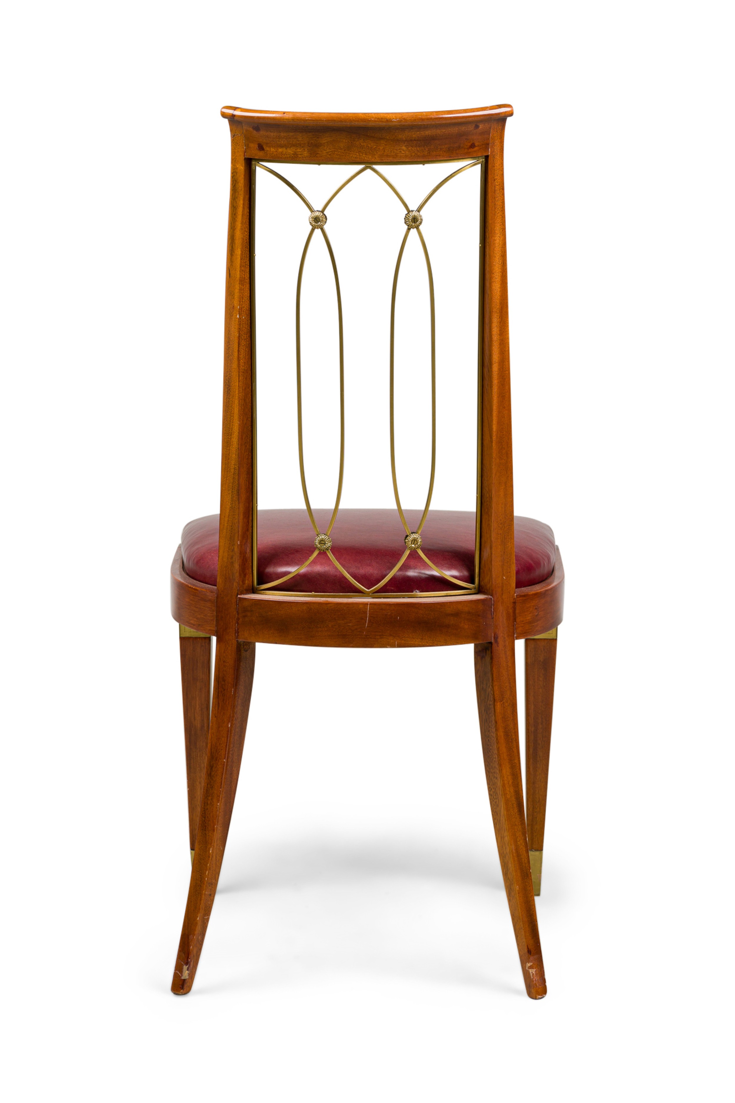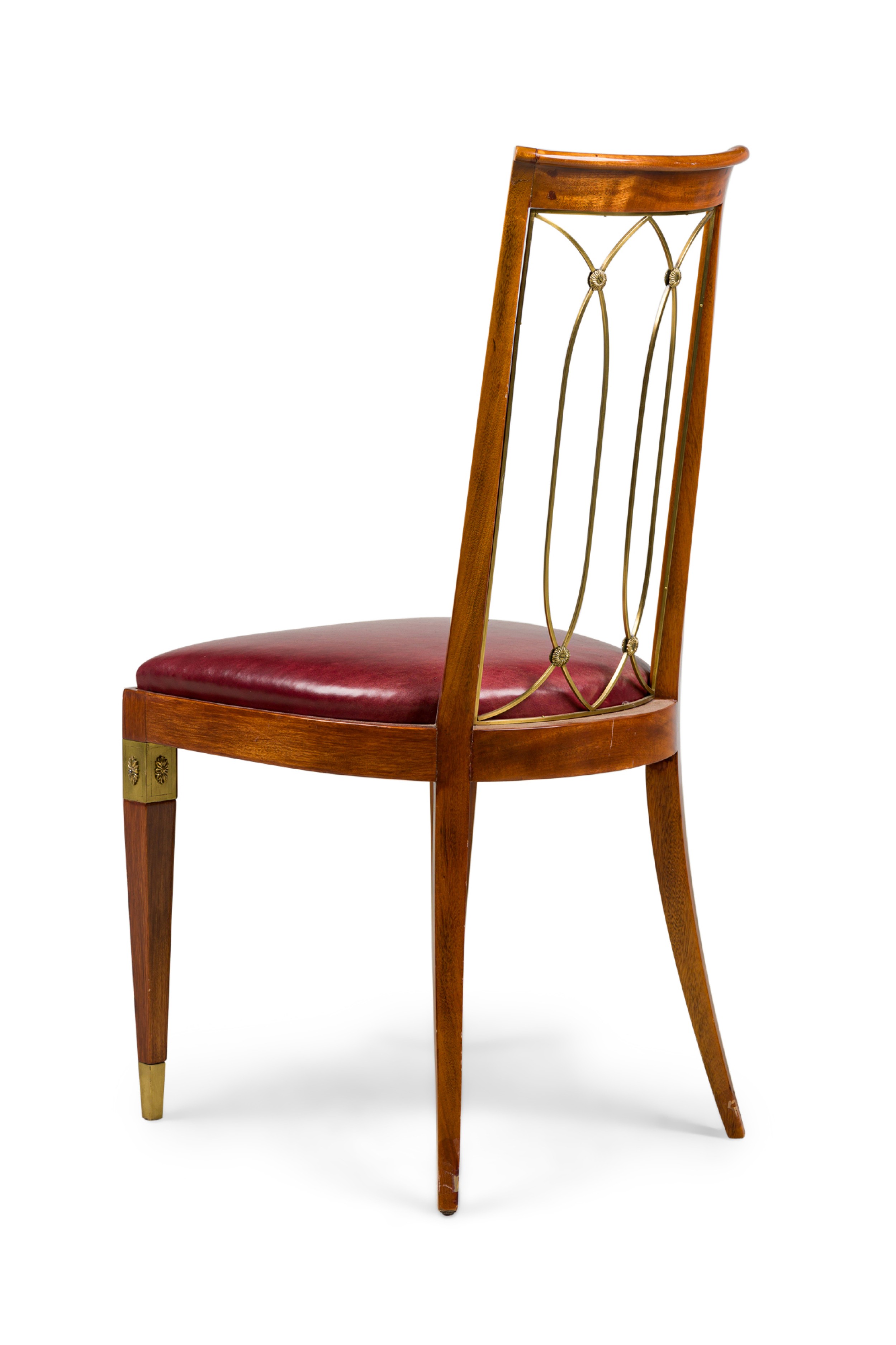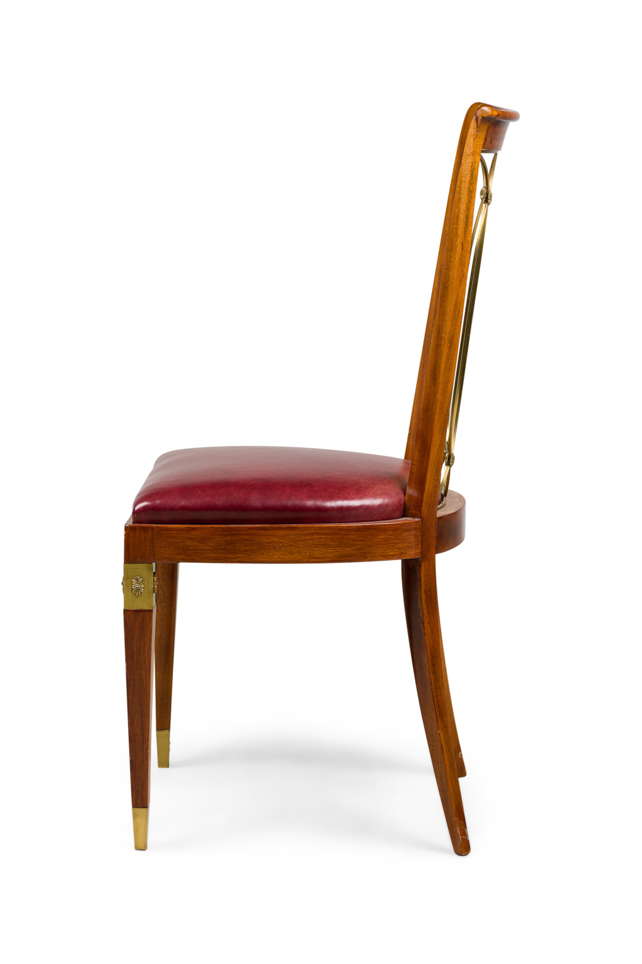 French Art-Deco mahogany brass open back side chair with a red leather seat (matching armchair: 063799A).