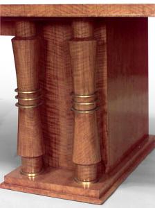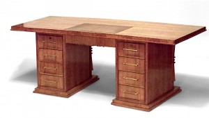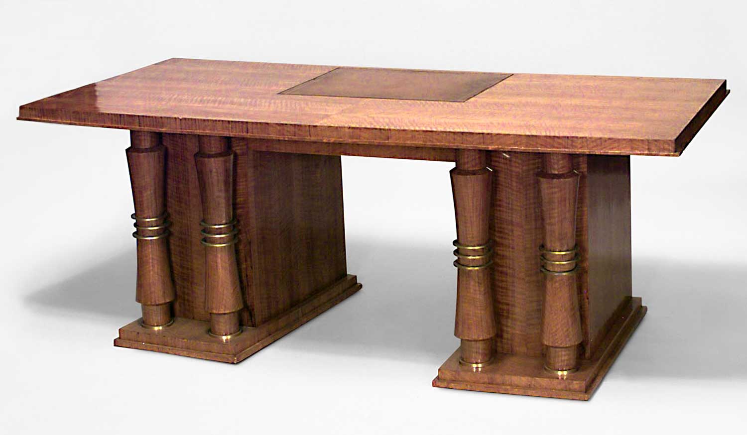 French Art Deco large mahogany kneehole desk with bronze column design trim and leather top. (JULES LELEU)