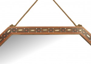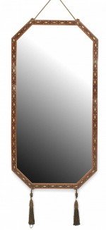 French Art Deco eight-sided mahogany wall mirror with an inlaid, trimmed border, two tassels, and narrow profile. (by MAURICE DUFRENE, DOCUMENTATION AVAILABLE)