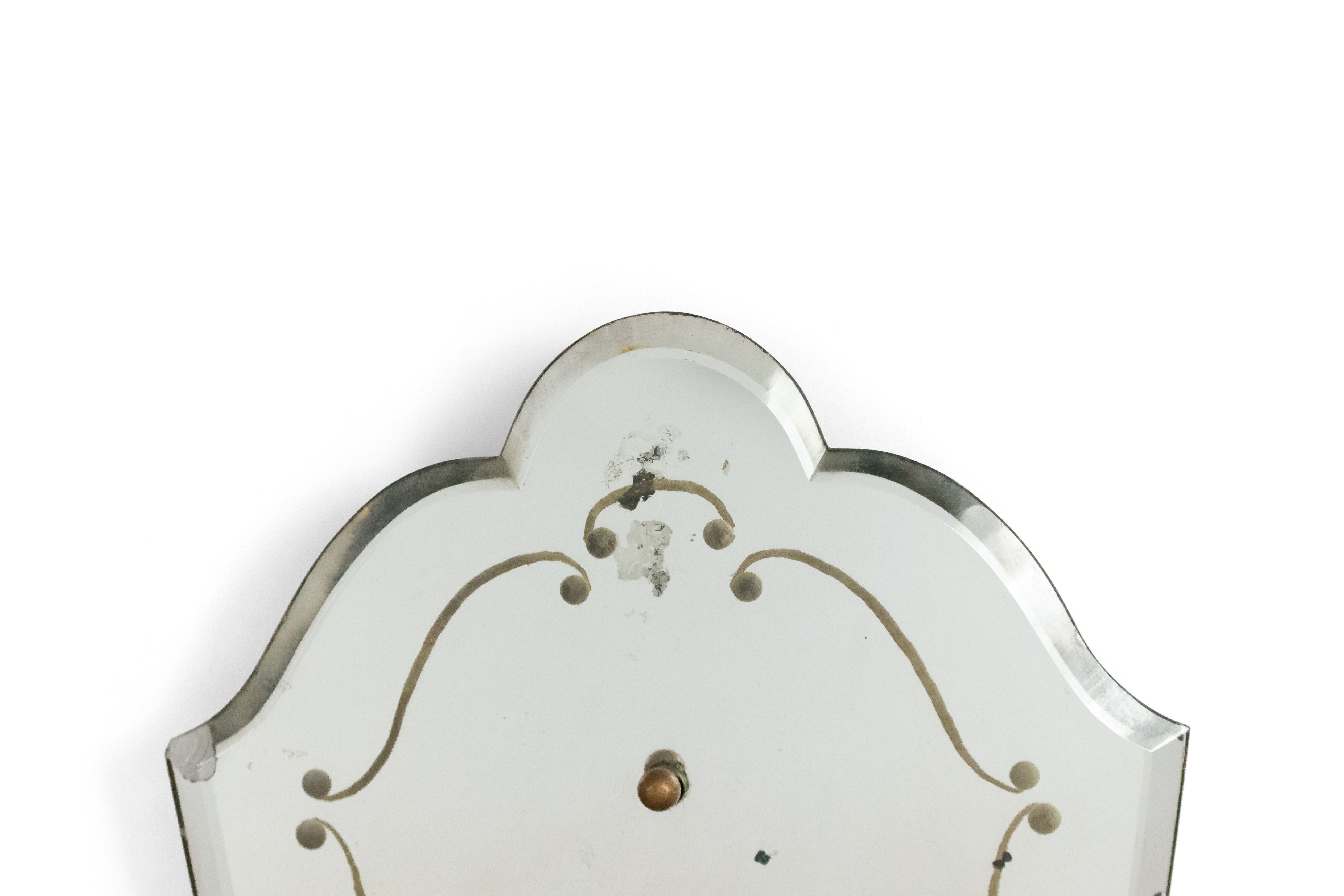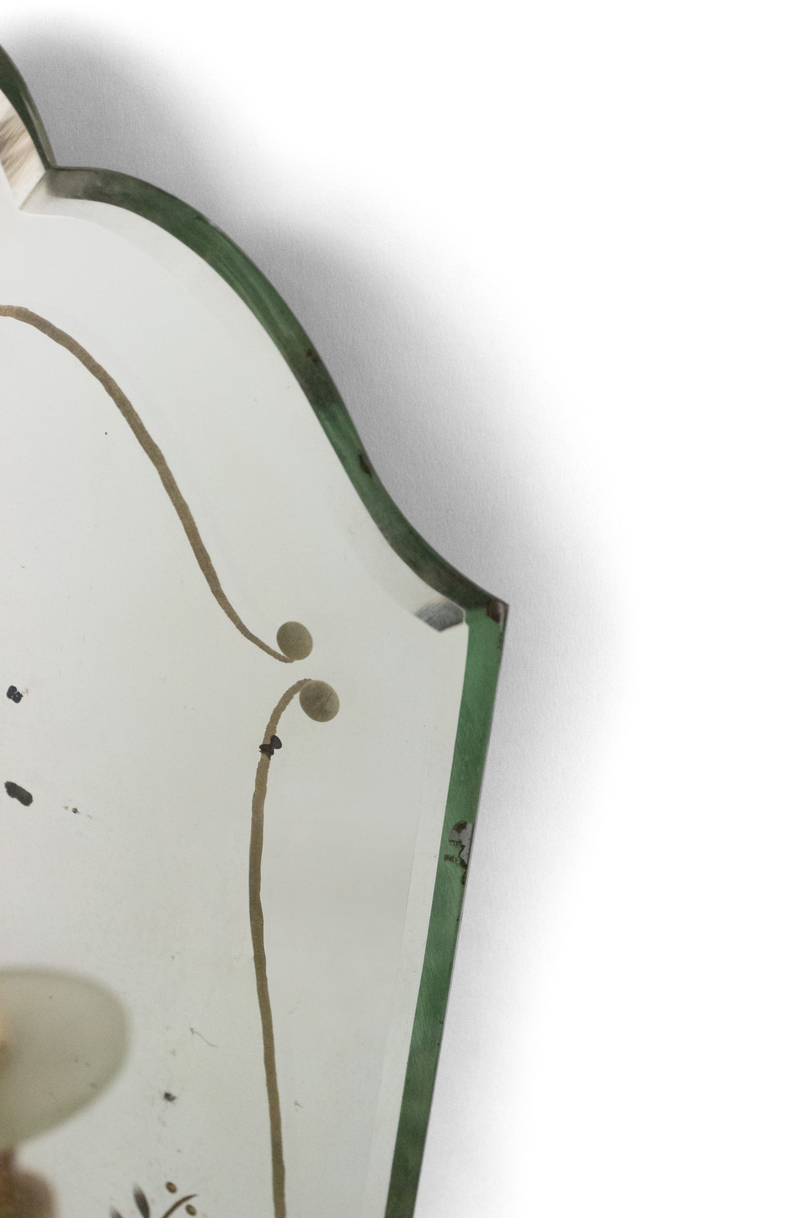 3 French Art Deco ormolu and etched mirror wall sconces with two arms and shield-shaped backplates engraved with floral motifs. (PRICED EACH).