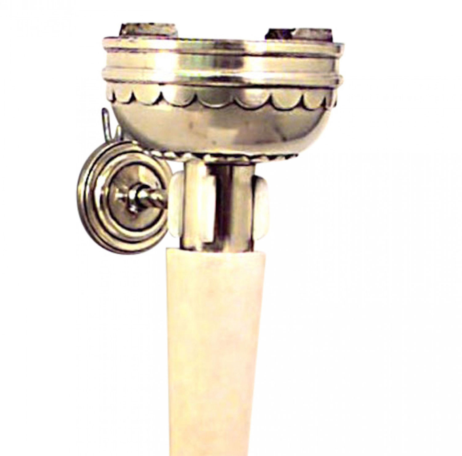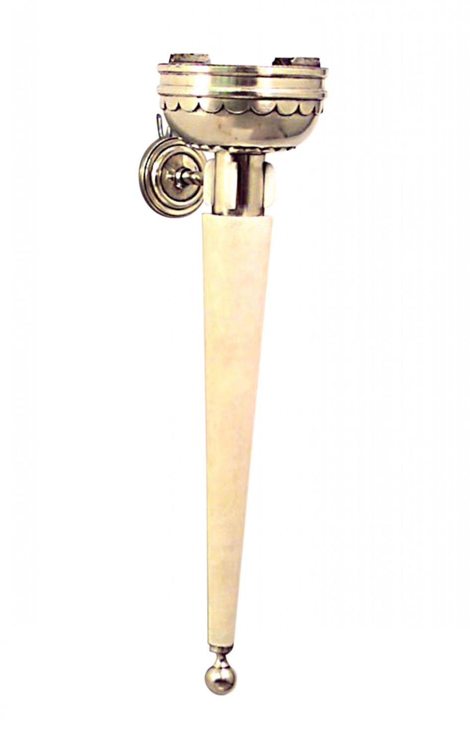 PAIR of French Art Deco wall sconces with parchment torch design, brass finial bottoms, and round bowl design tops. (PRICED AS PAIR)