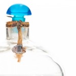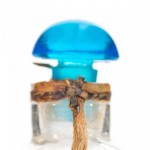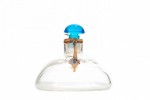French Art Deco round squat clear glass perfume bottle with a dome-shaped blue tinted glass stopper.