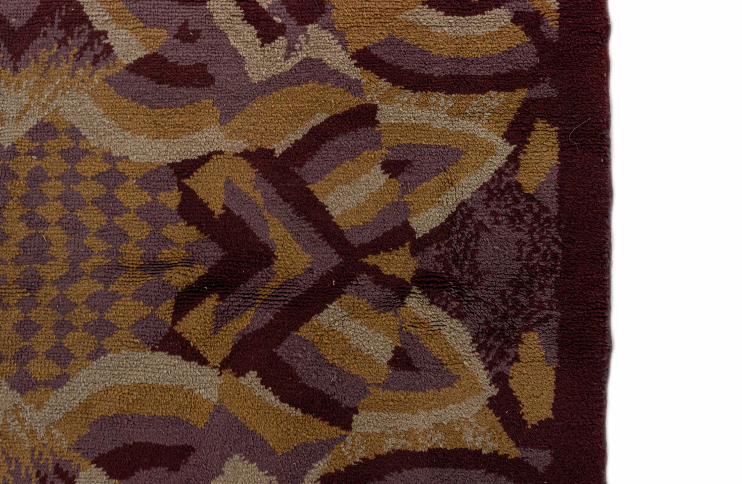 French Art Deco geometric design rug carpet with purple and beige colors signed with the initial "R" inside a "C" (5.5 x 7.5').