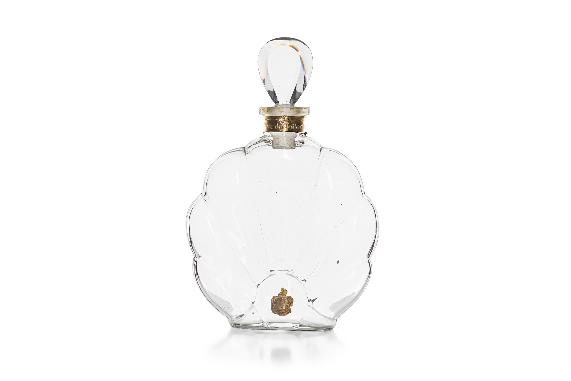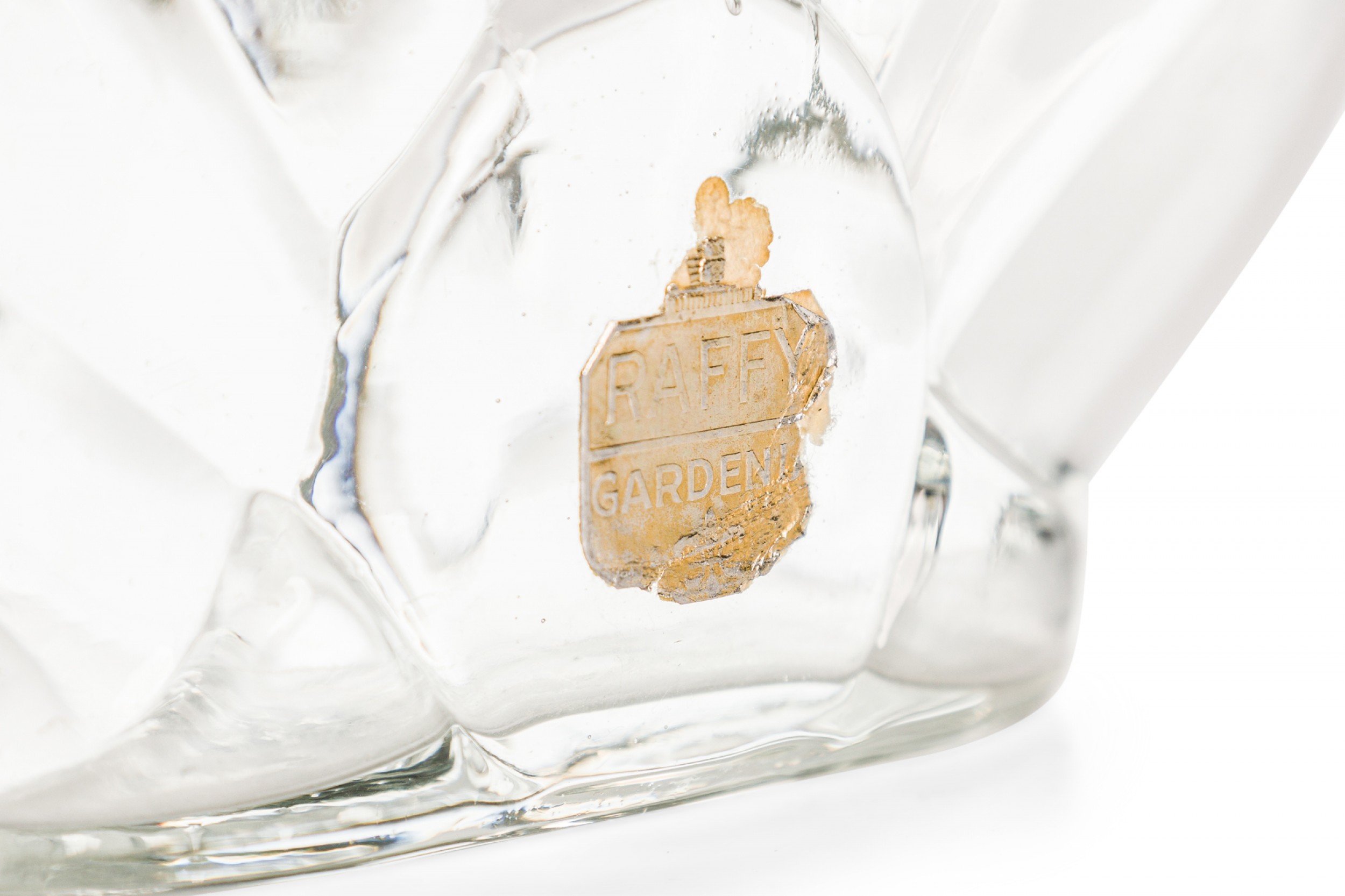 French Art Deco large scallop-shaped clear glass perfume bottle with an inverted teardrop-shaped clear glass stopper with a beveled edge. ("RAPSODIE" by RAFFY).