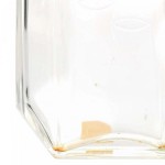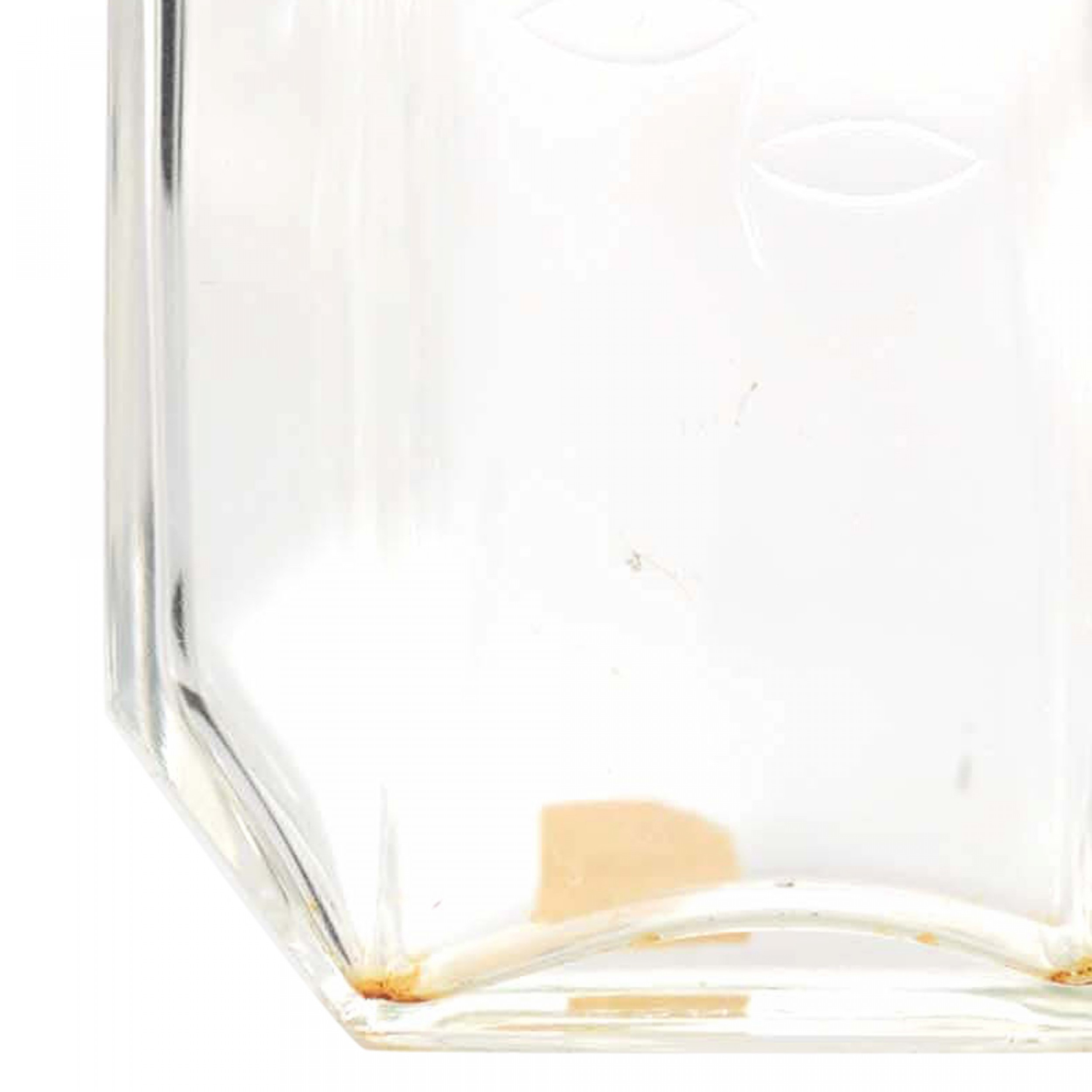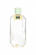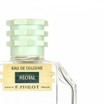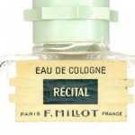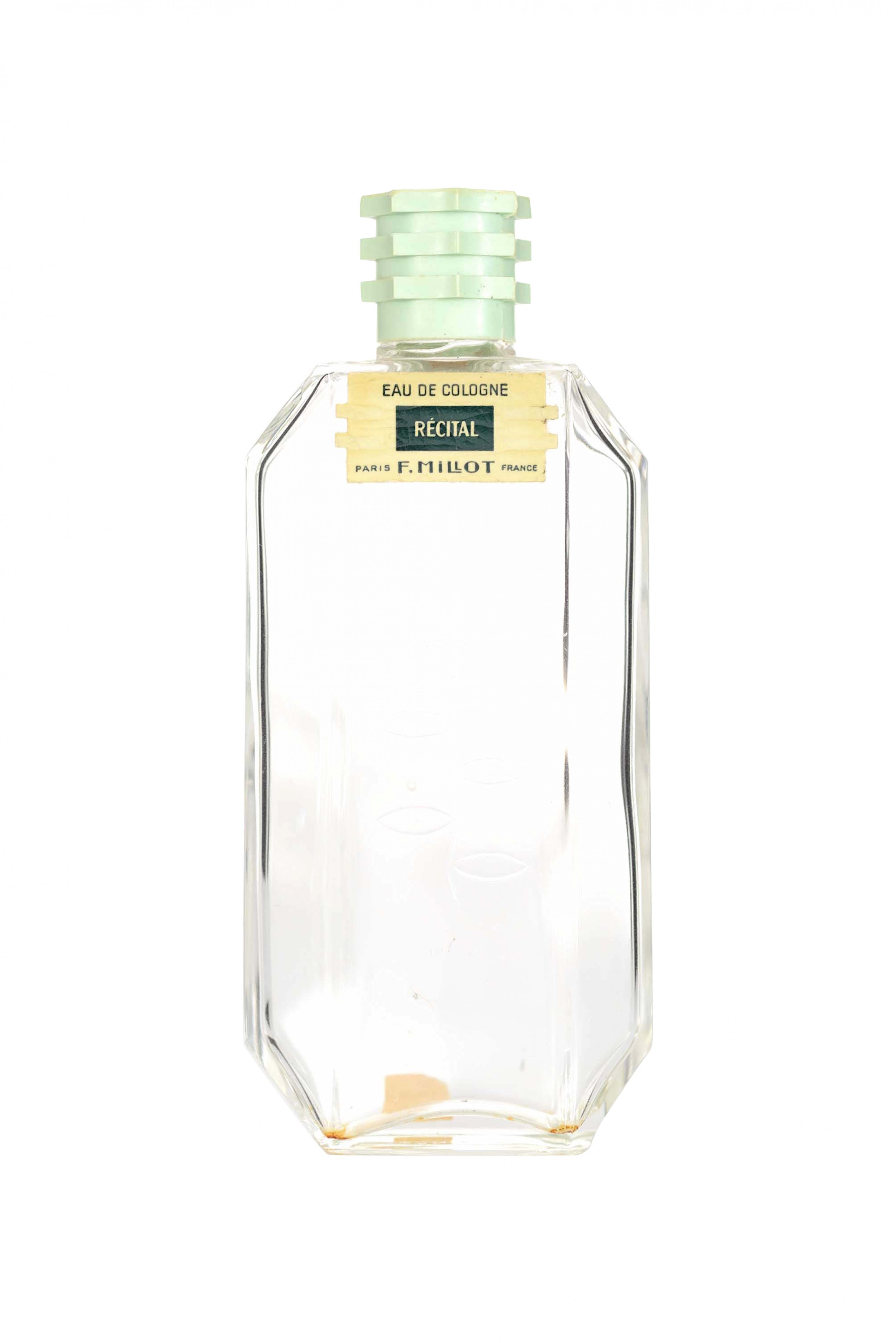 French Art Deco tall faceted clear glass perfume bottle (RECITAL by F. MILLOT) with an incised flower design, a label, and a light green plastic stopper with a tiered design..