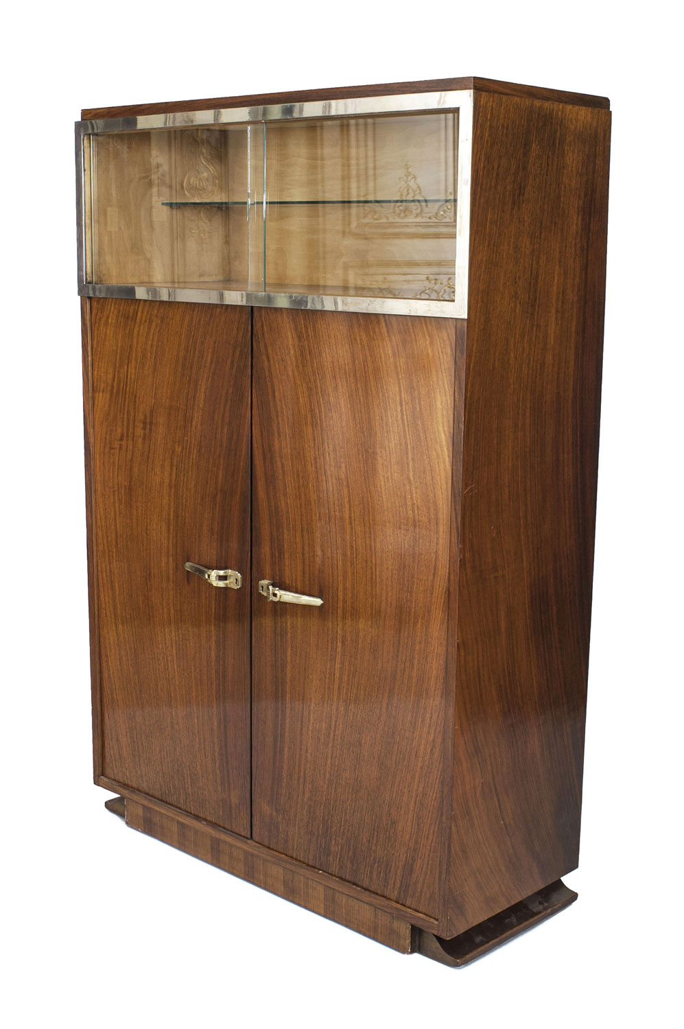 Style: Art Deco Materials & Techniques: Brass, glass, rosewood, wood Category: Cabinets & Case Goods Condition: Ships with no key. Good; Wear consistent with age and use