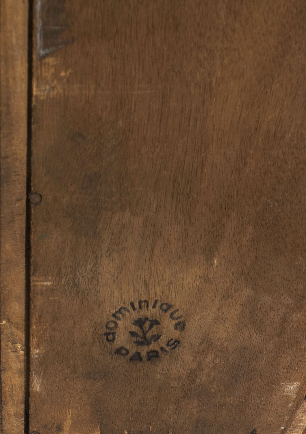 French Art Deco rosewood vitrine/bar cabinet with to glass top sliding doors framed in chrome above to large doors with brass decorative handles (branded: DOMINIQUE, PARIS).
