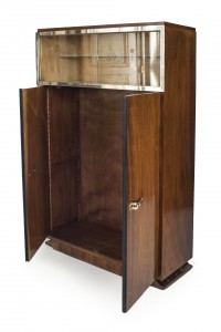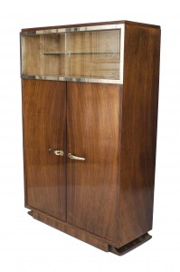French Art Deco rosewood vitrine/bar cabinet with to glass top sliding doors framed in chrome above to large doors with brass decorative handles (branded: DOMINIQUE, PARIS)