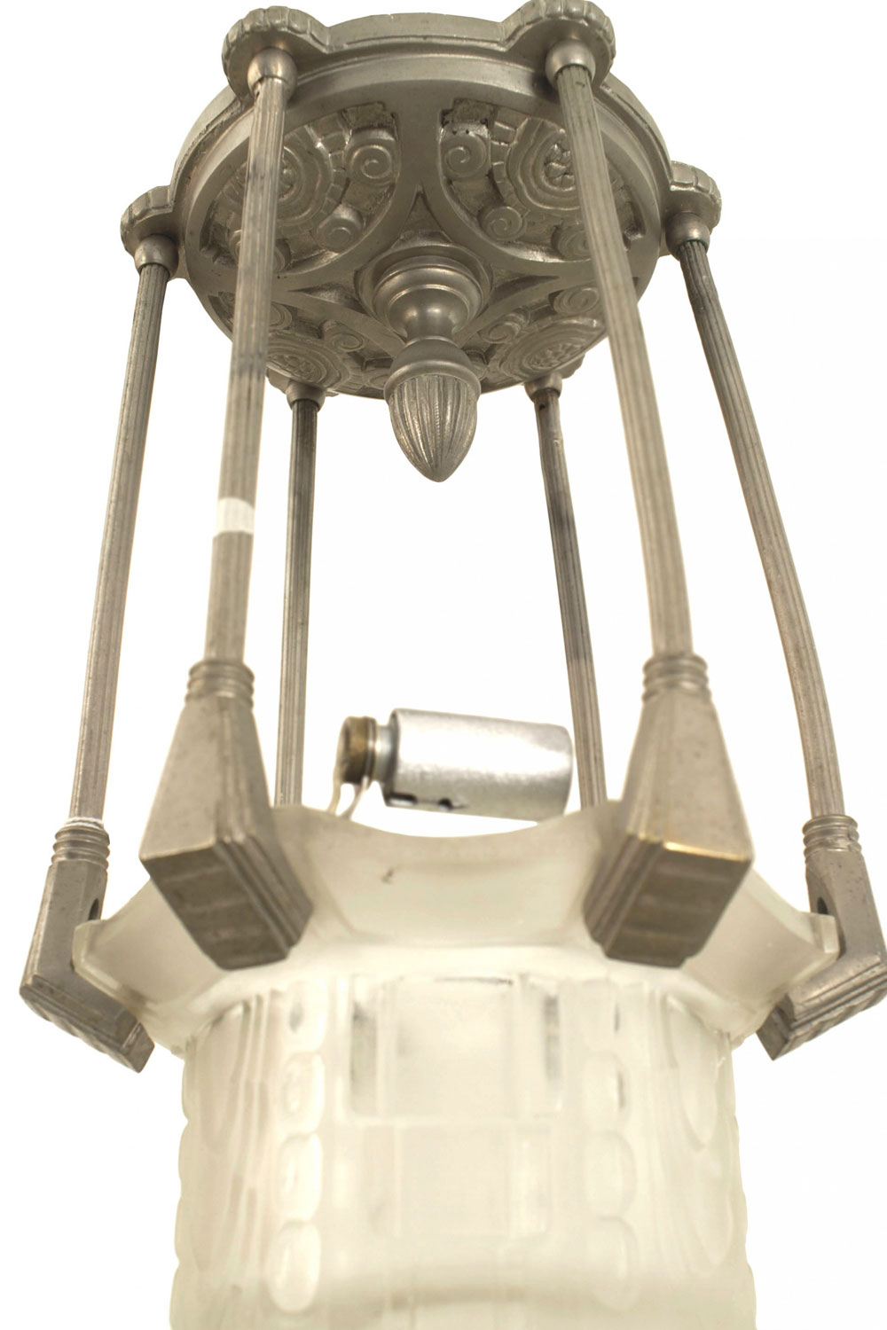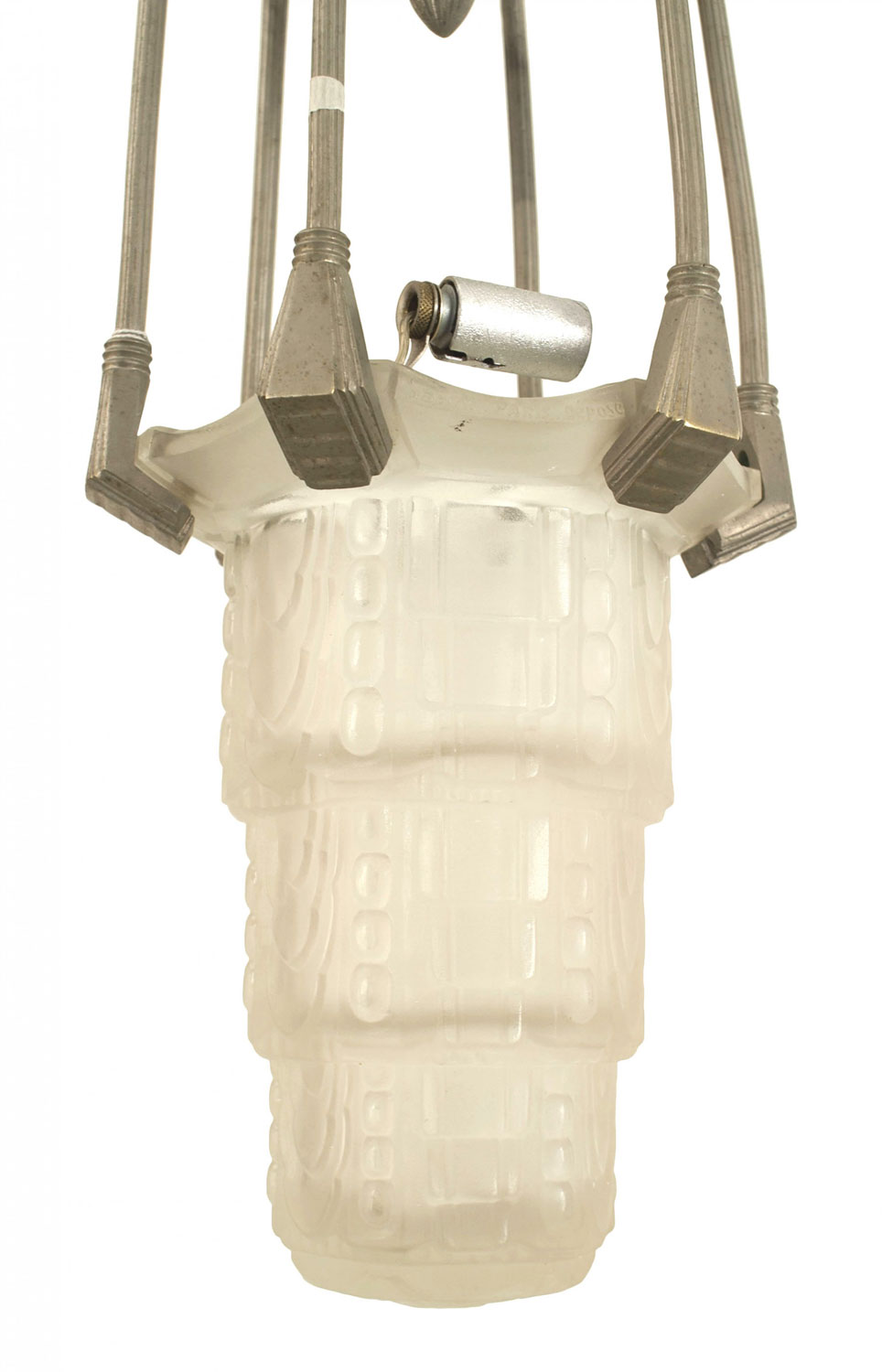 French Art Deco (circa 1925) small lantern with a 6 sided frosted 3 tier molded glass shade suspended from a silvered metal frame under a large round canopy (SABINO).