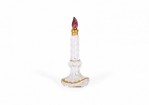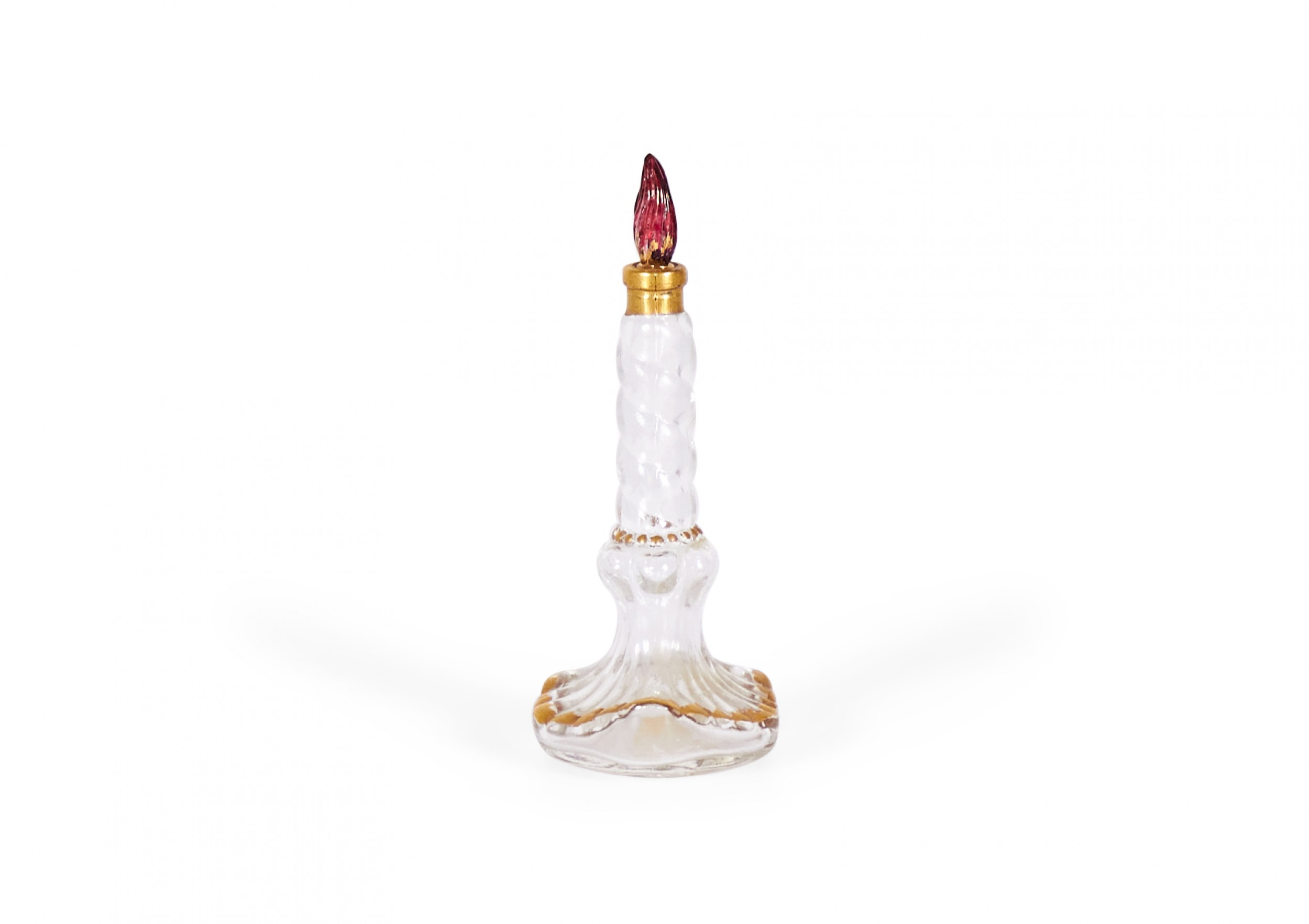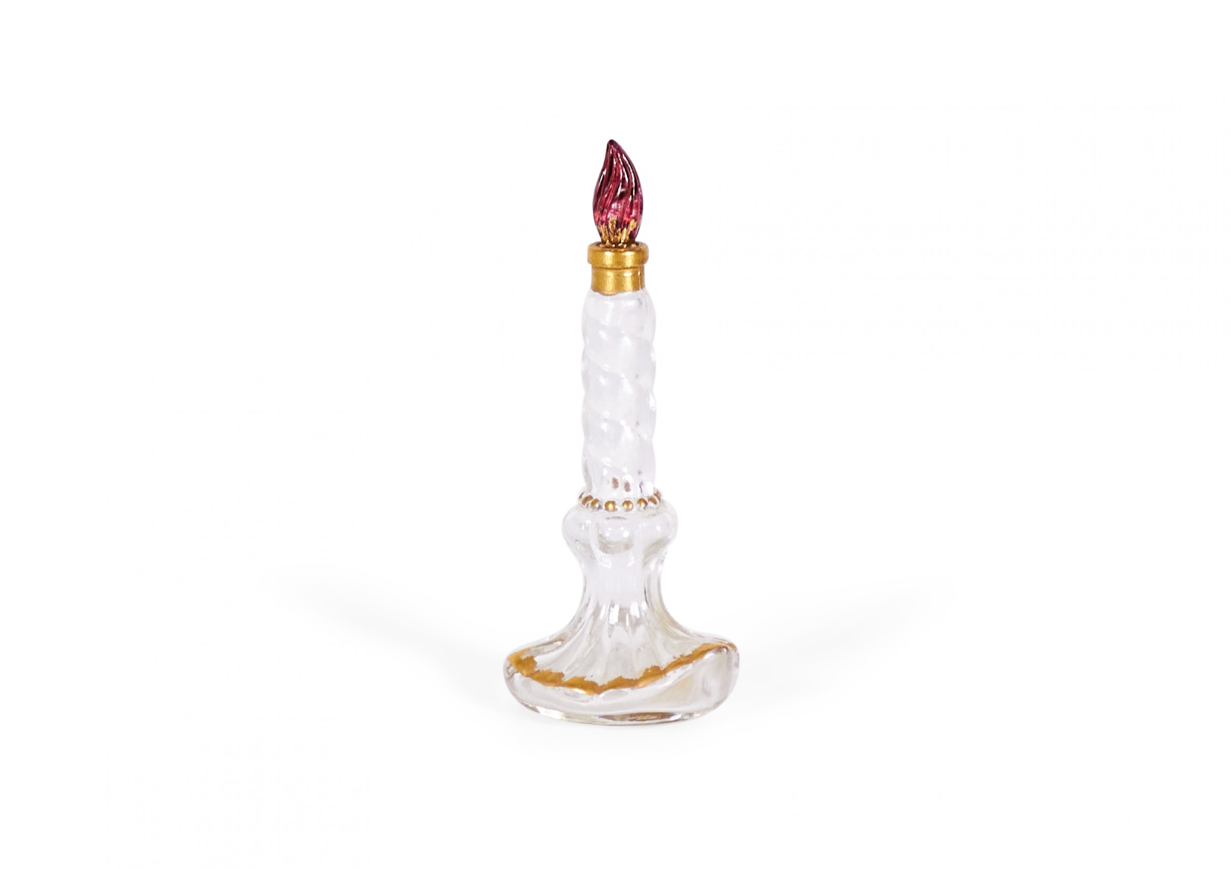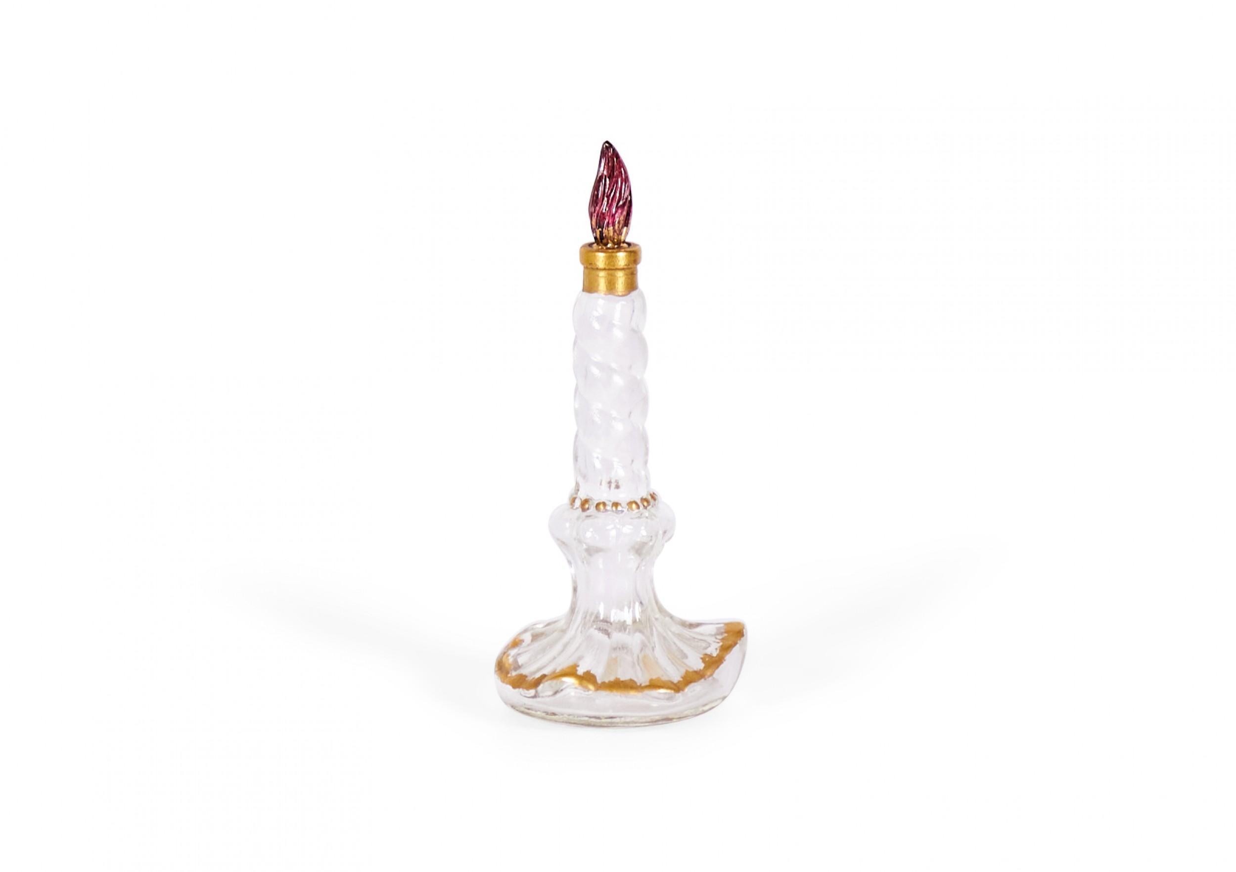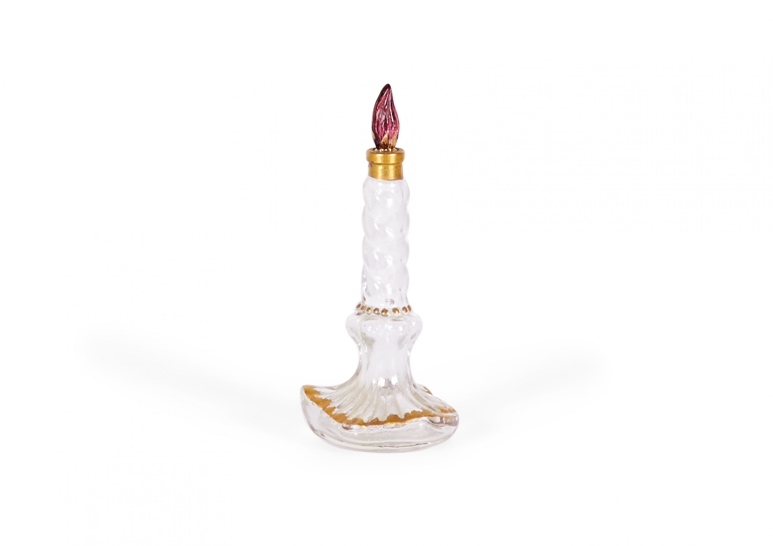 French Art Deco clear glass perfume bottle (SLEEPING by ELSA SCHIAPARELLI) shaped like a candle in a candle holder with gilded trims and a red-tinted glass stopper shaped like a candle flame (BACCARAT).