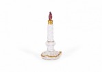 French Art Deco clear glass perfume bottle (SLEEPING by ELSA SCHIAPARELLI) shaped like a candle in a candle holder with gilded trims and a red-tinted glass stopper shaped like a candle flame (BACCARAT)