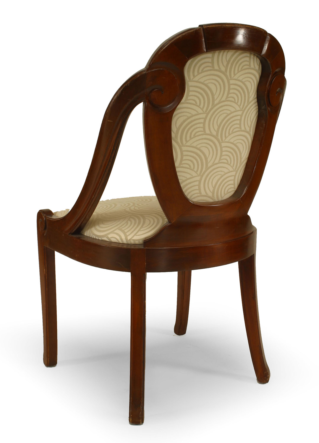 24 French Art Deco stained mahogany carved scroll back side chairs with upholstered seat and back (manner of Sue et Mare) PRICED EACH.