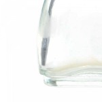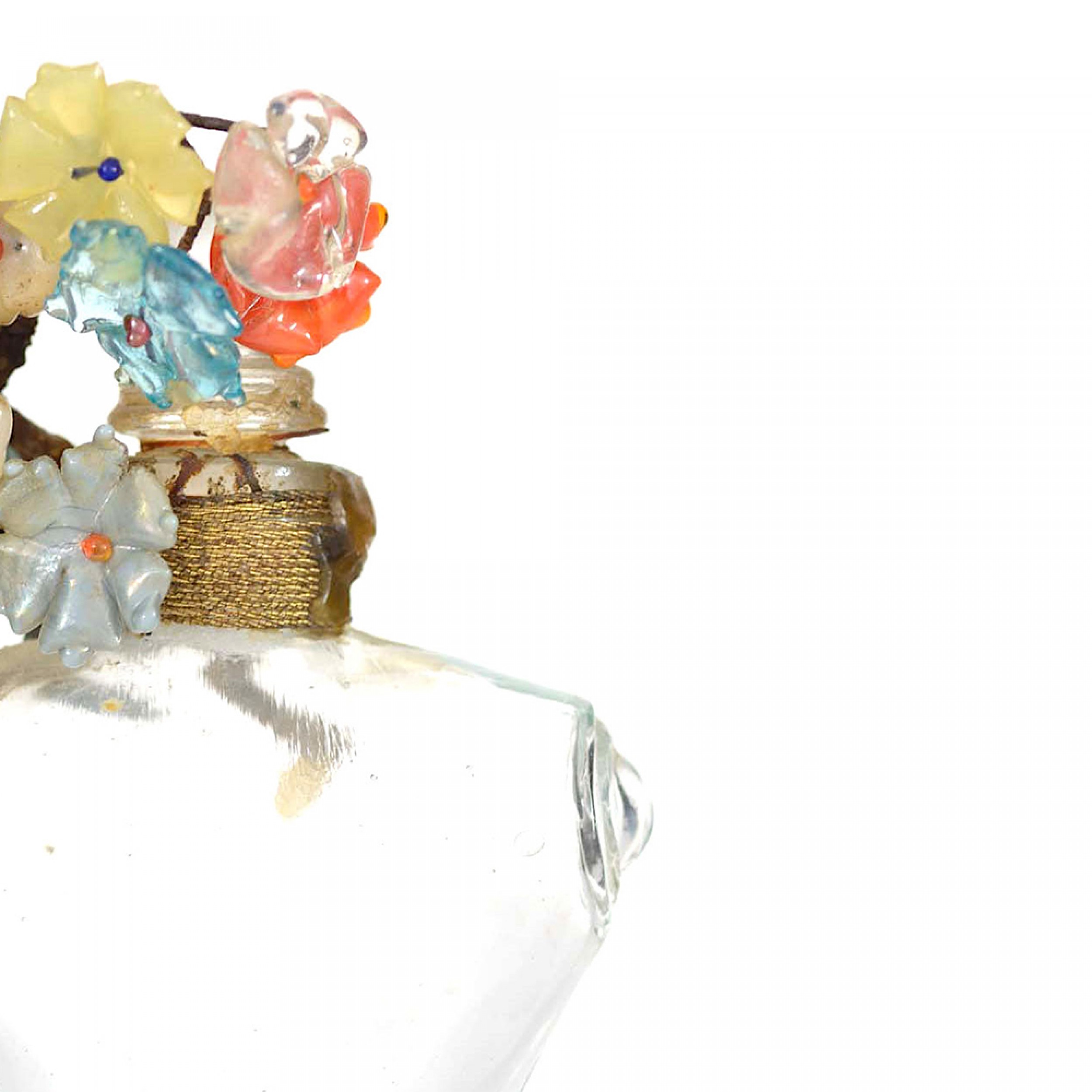 French Art Deco rectangular clear glass perfume bottle (SHOCKING by SCHIAPARELLI) shaped like a dressmaker dummy female torso, with multicolored glass flowers wrapped around the necks and a ball-shaped glass stopper.