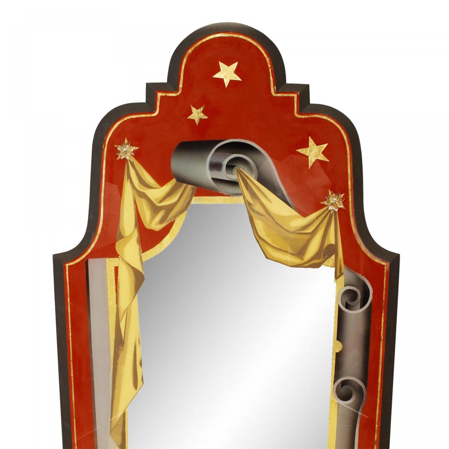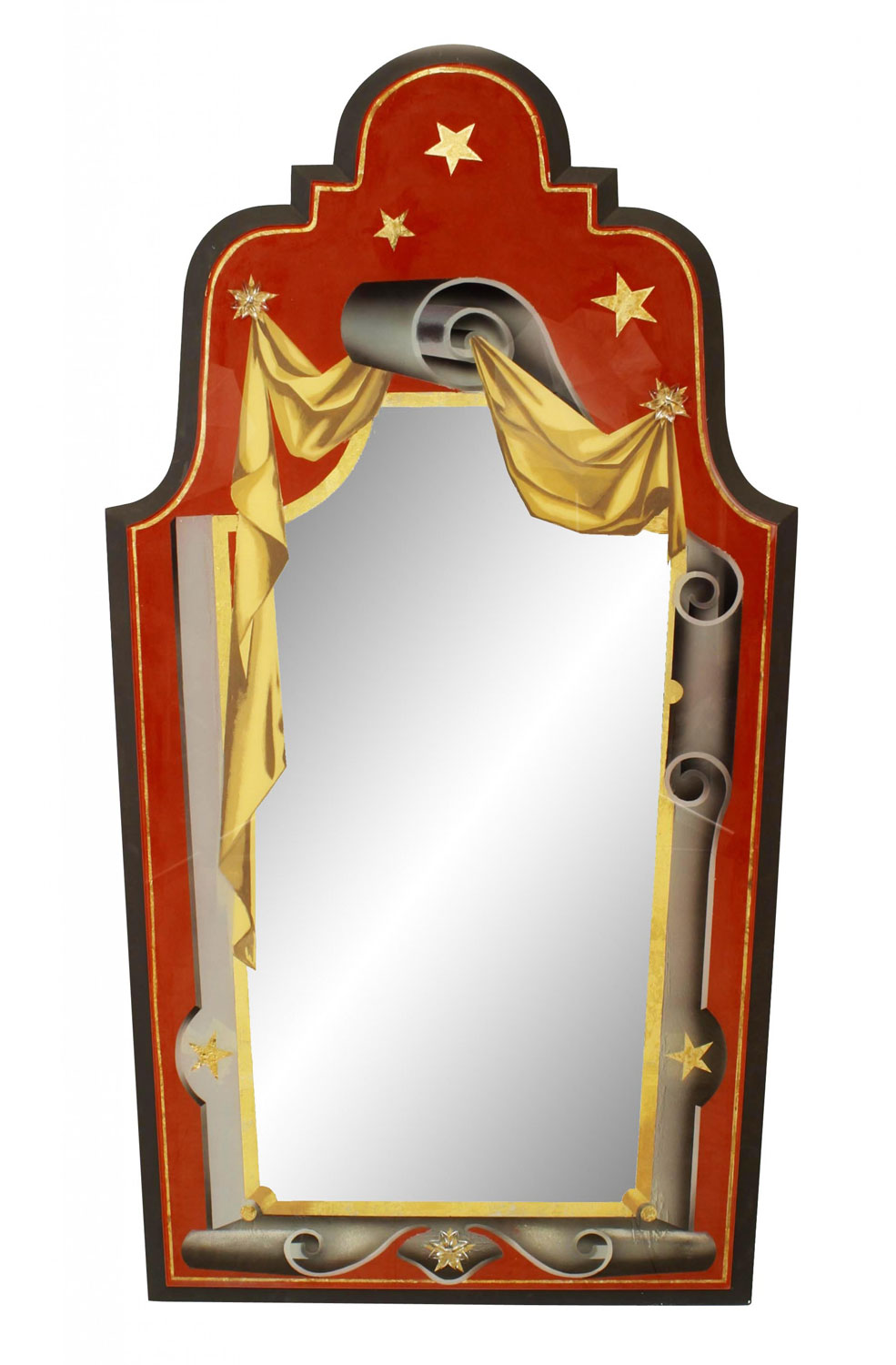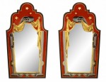 PAIR of French Art Deco-style red, gold, and grey painted eglomise wall mirrors with scroll and star designs and shaped pediments in an ebonized wood frame.(left & right scroll tops) (PRICED AS PAIR)