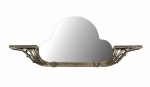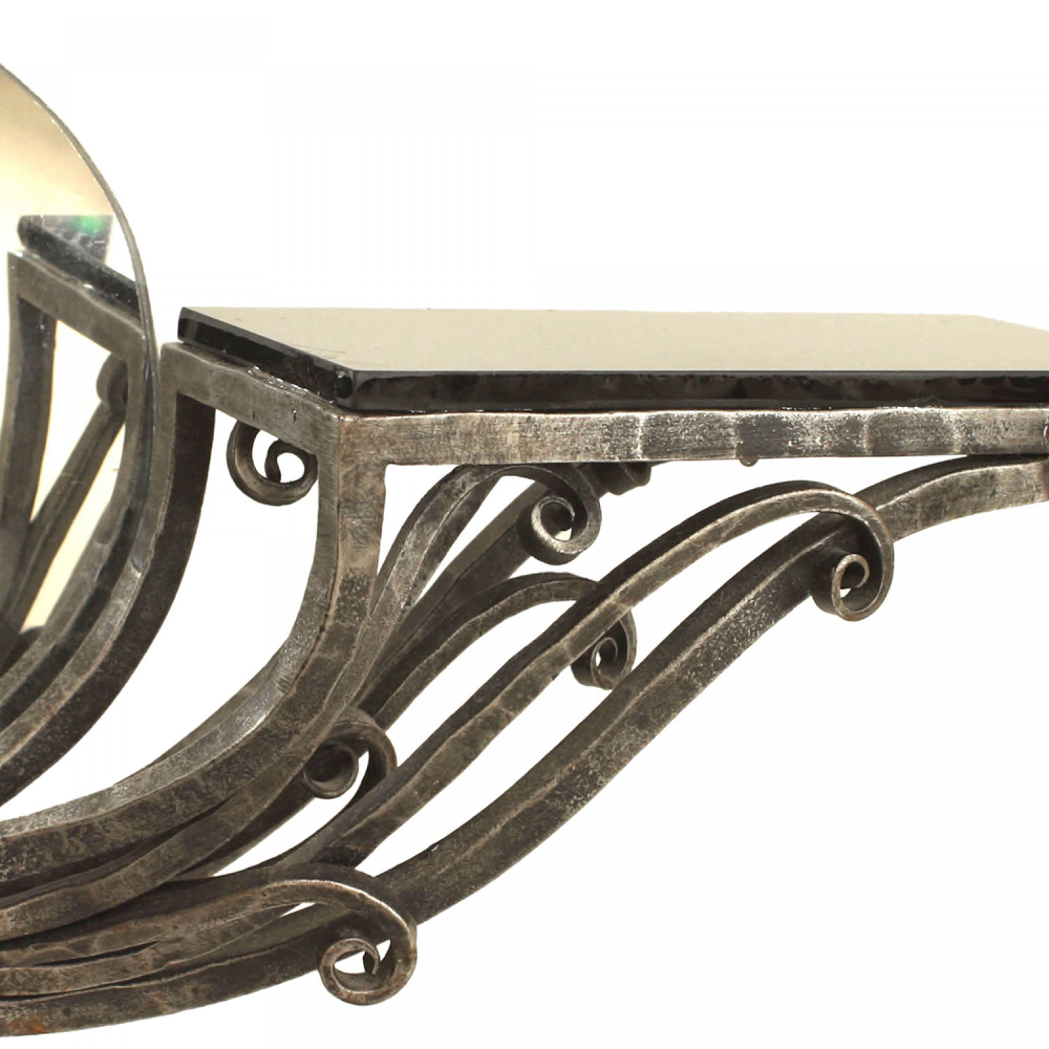 French Art Deco-style wrought iron wall mirror with small side shelves centering a shaped, scalloped-form mirror..