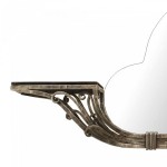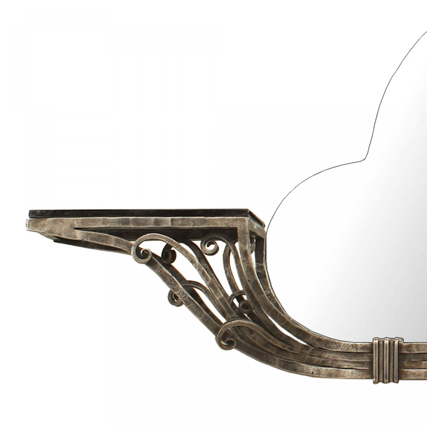 French Art Deco-style wrought iron wall mirror with small side shelves centering a shaped, scalloped-form mirror.