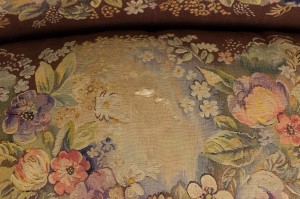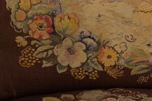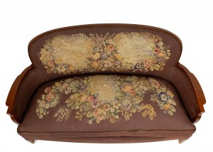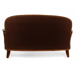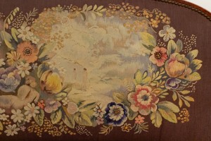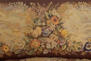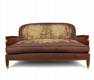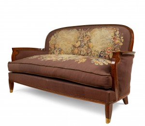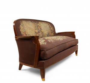 French Art Deco loveseat with tapestry upholstery (seat cushion AS IS) having a round back & scroll design arm (by JULES LELEU) (c.1940) Ref: Decorateurs Ensemble, Francoise Siriex) (similar bergeres: GRL4554, 2 arms: CHM006)