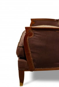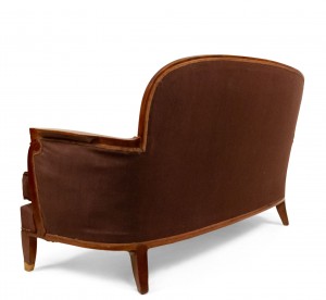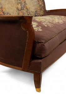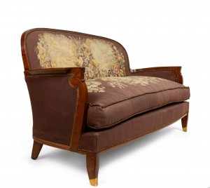 French Art Deco loveseat with tapestry upholstery (seat cushion AS IS) having a round back & scroll design arm (by JULES LELEU) (c.1940) Ref: Decorateurs Ensemble, Francoise Siriex) (similar bergeres: GRL4554, 2 arms: CHM006).
