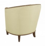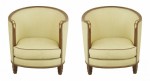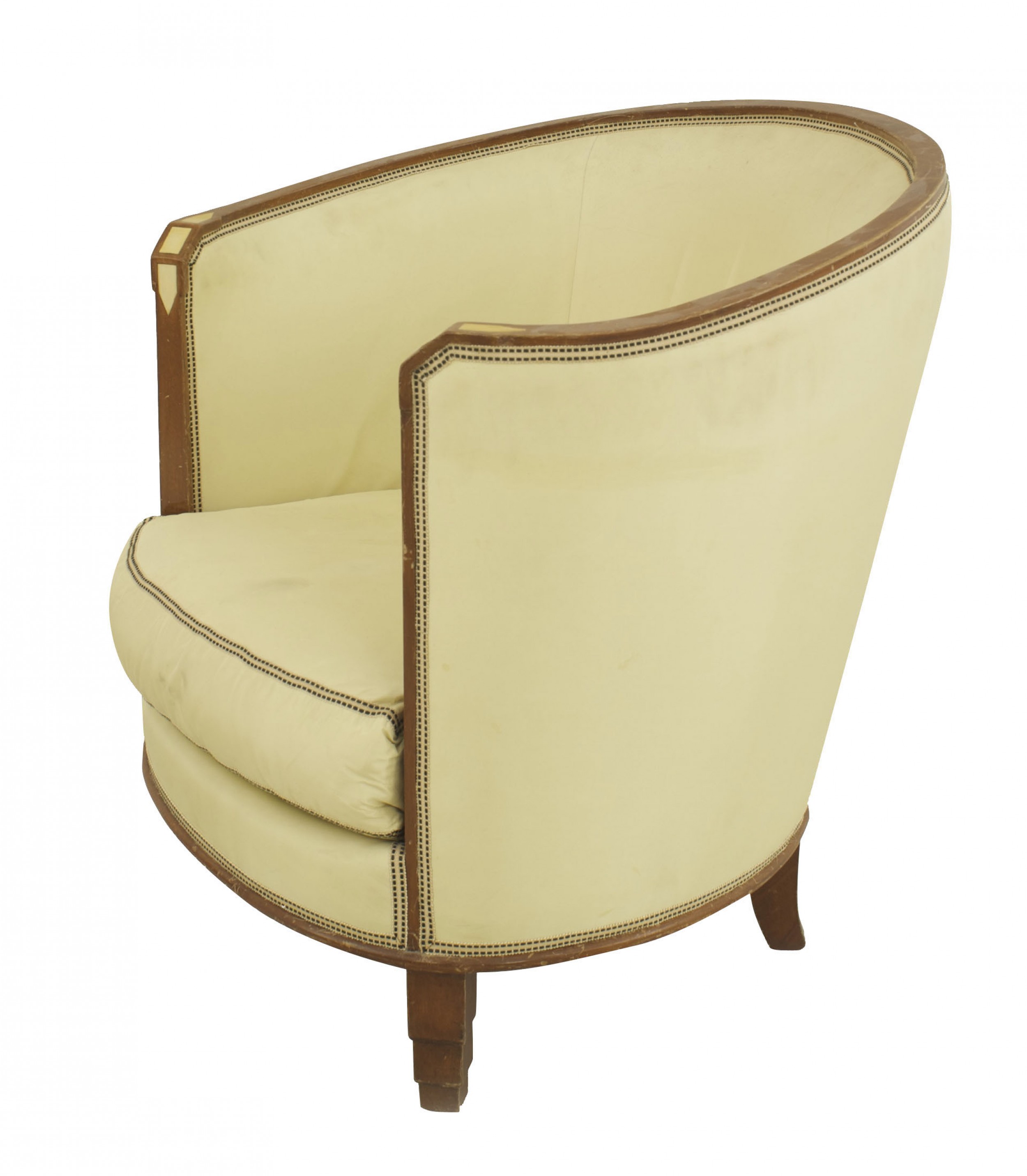 PAIR of French Art Deco round barrel back mahogany tub form Armchairs with inlaid trim on front of arms and upholstered in yellow satin with a seat cushion. (PRICED AS PAIR)