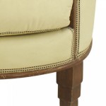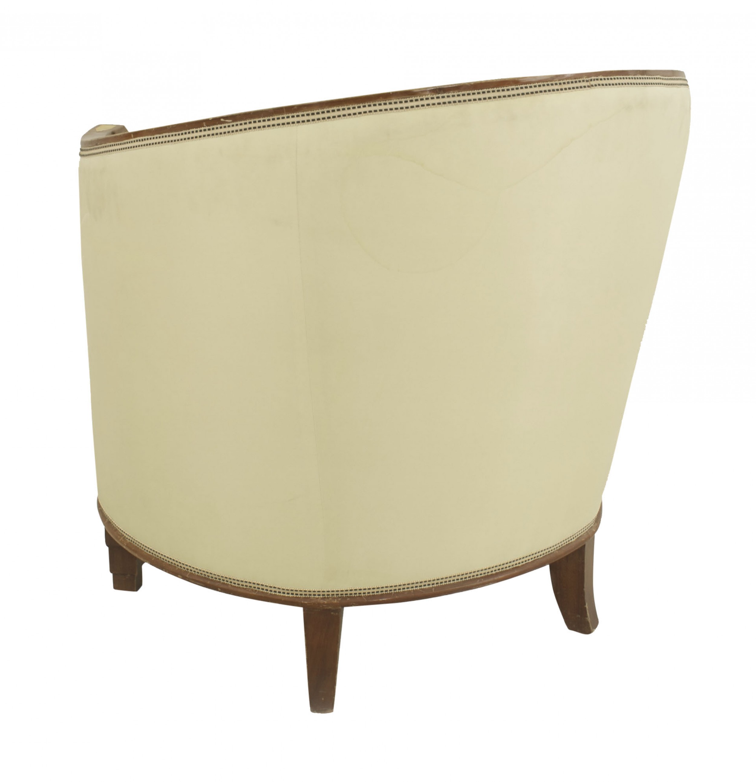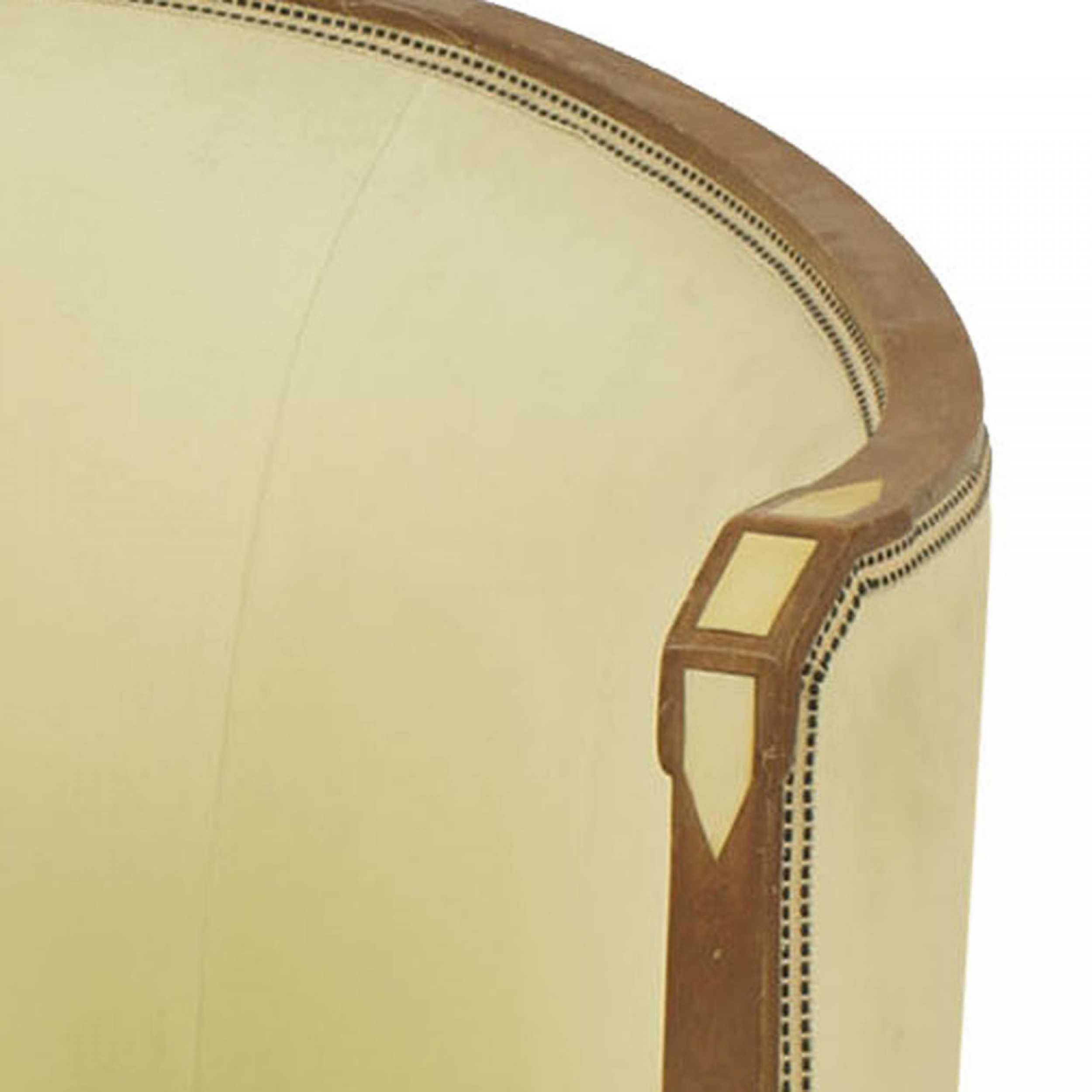 Style: Art Deco Materials & Techniques: Inlaid, mahogany, walnut Category: Seating Condition: Some light water staining on upholstery and subtle scratching on frame.