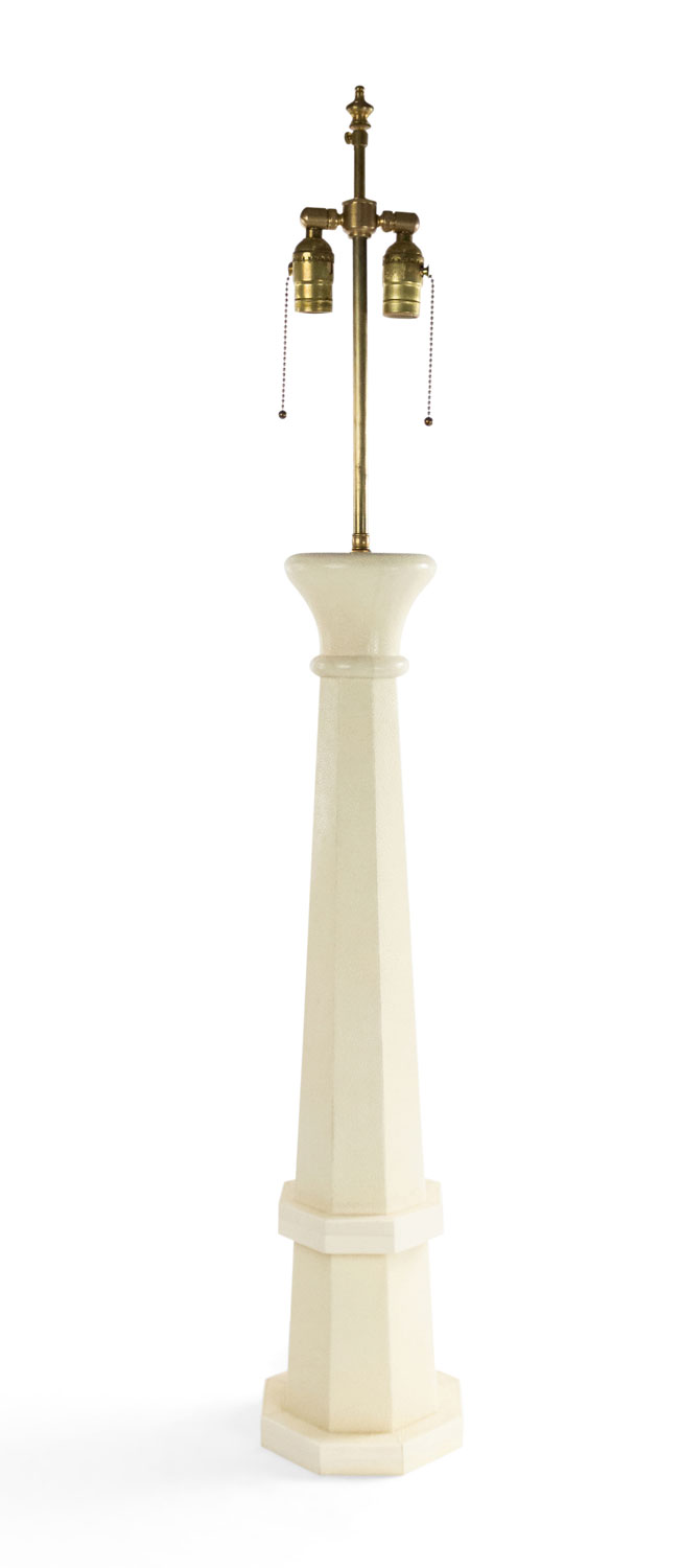 French Art Deco style white shagreen and bone inlaid trim table lamp with a tapered octagonal shape..