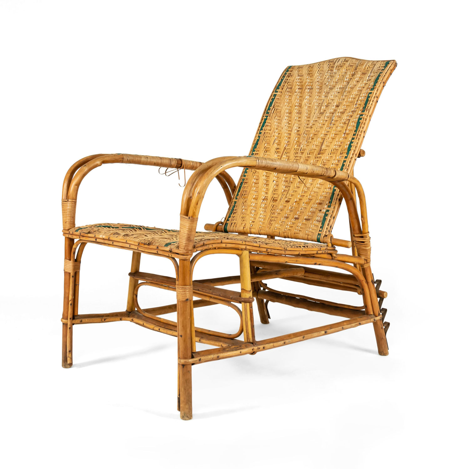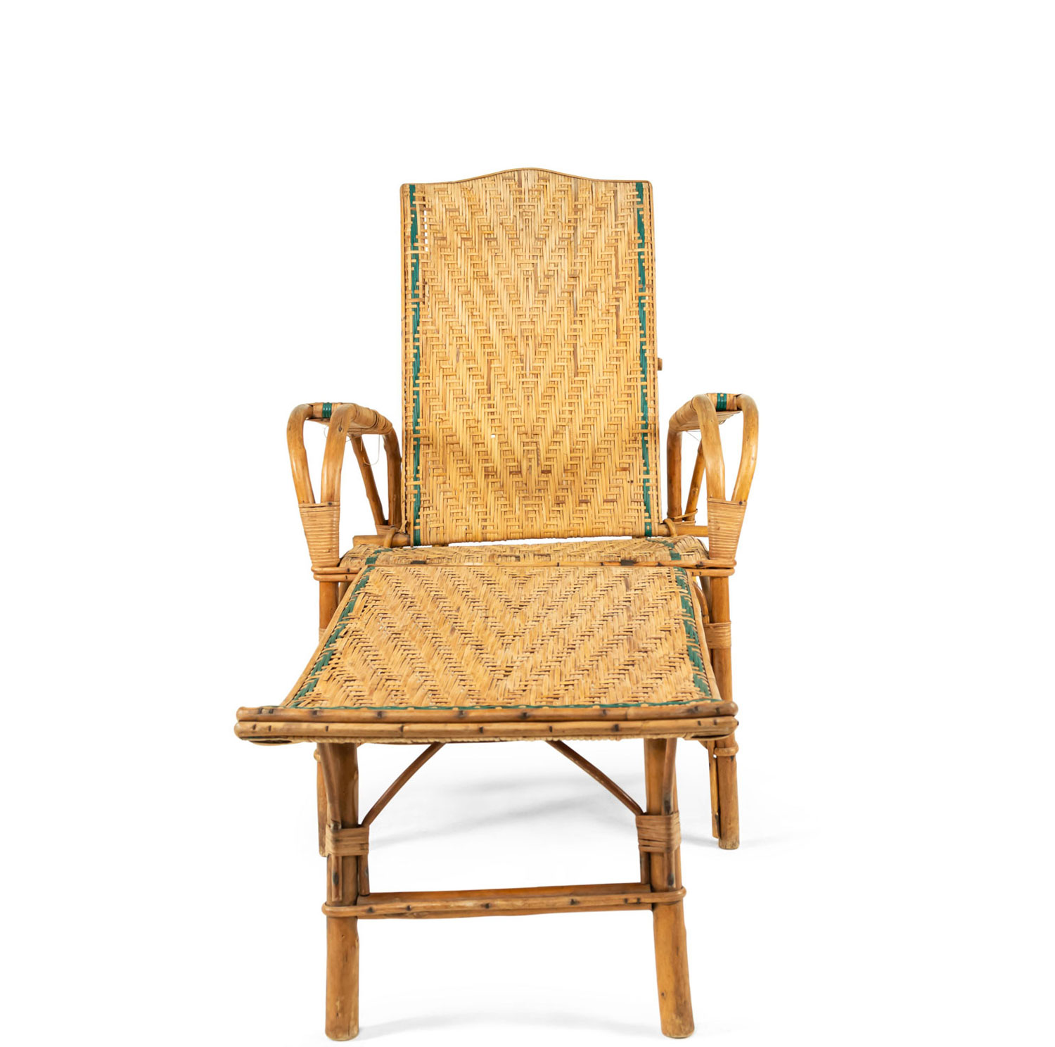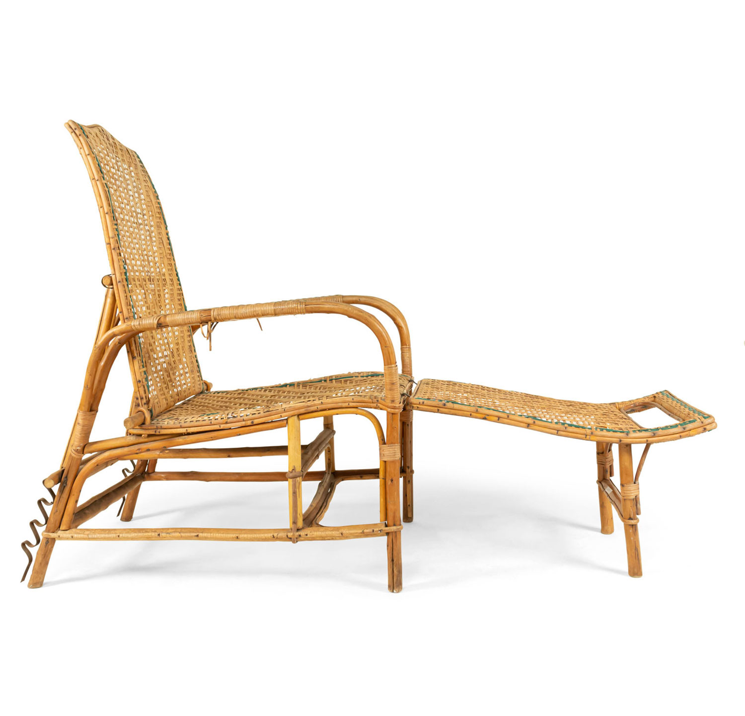 French Art Deco natural wicker and bentwood adjustable back chaise with separate footrest with light blue trim
