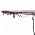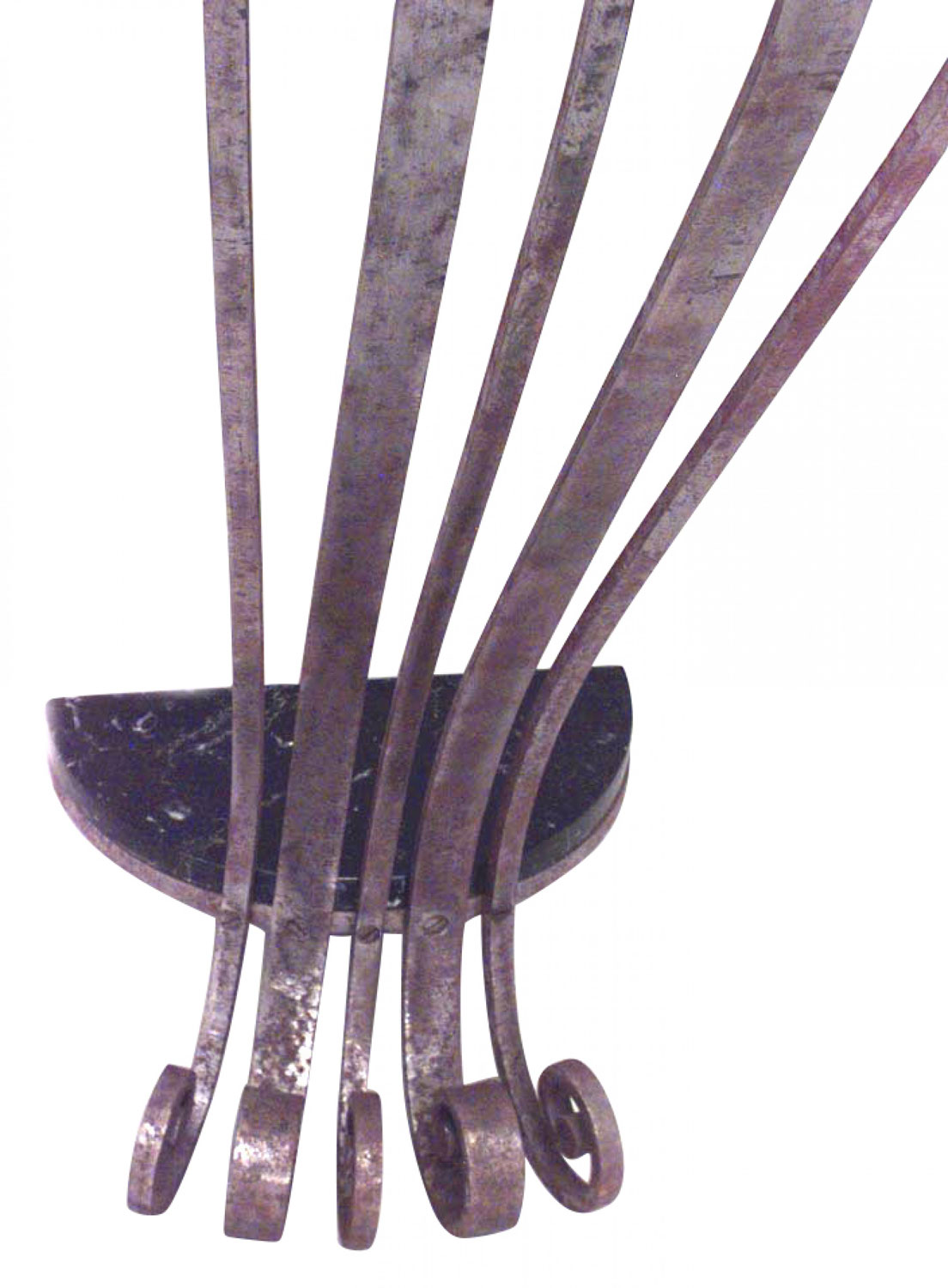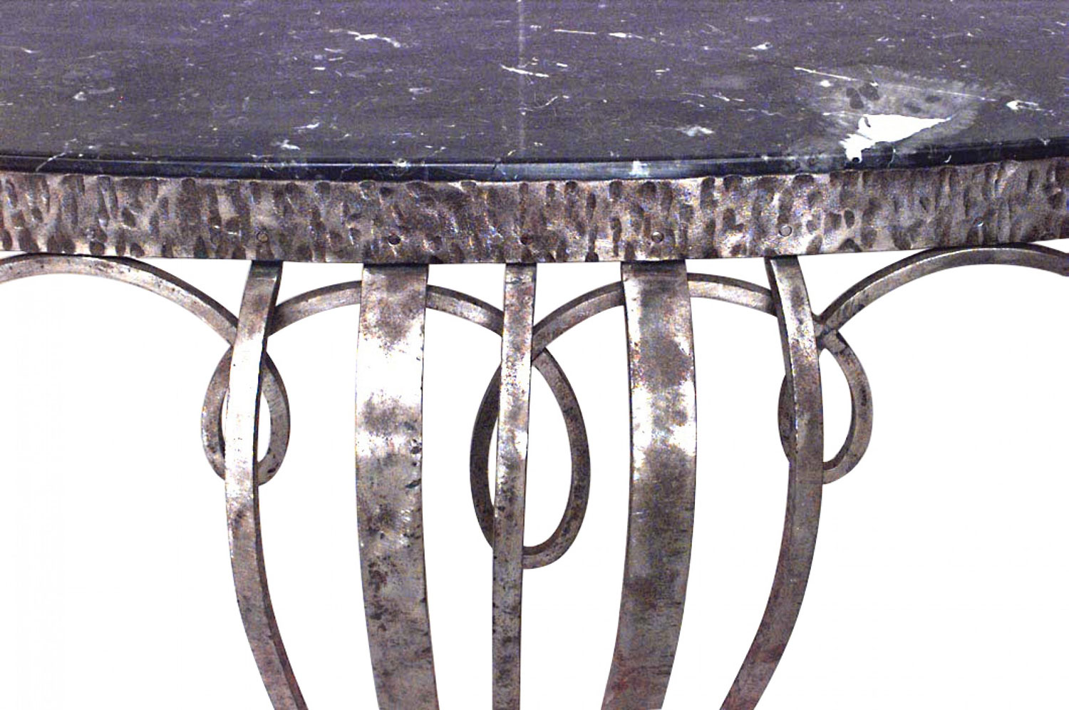 French Art Deco wrought iron bracket console table with scroll design front supports & apron with black marble top and small shelf at base (Attributed to RAYMOND SUBES)