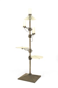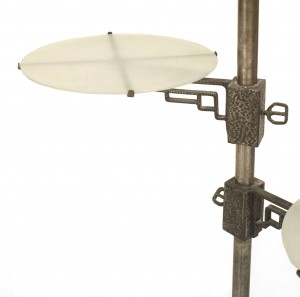 French Art Deco wrought iron floor lamp with 2 adjustable round frosted glass platform shelves below 2 adjustable side lights. (by ZADOUNAISKY, 1903-1983 France)