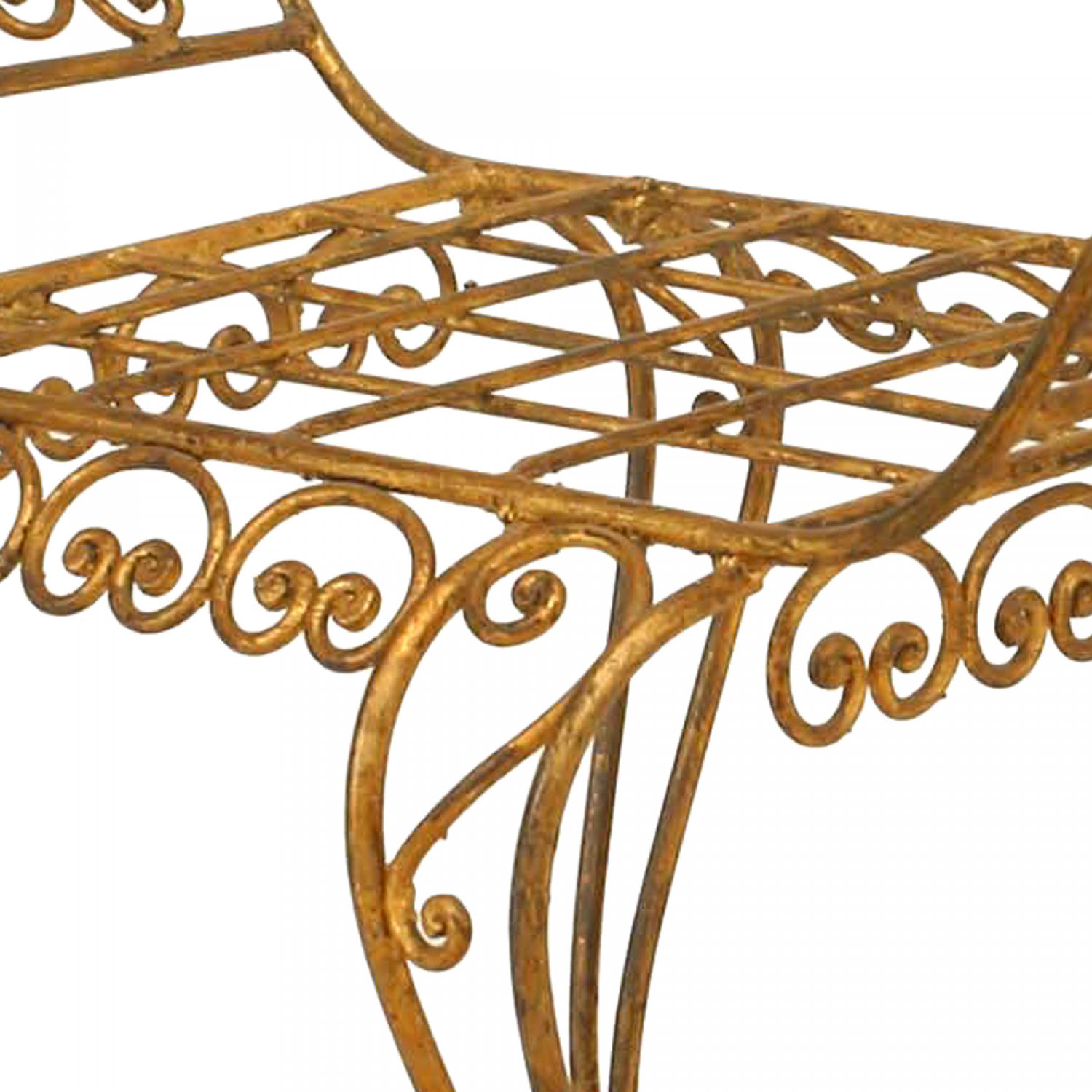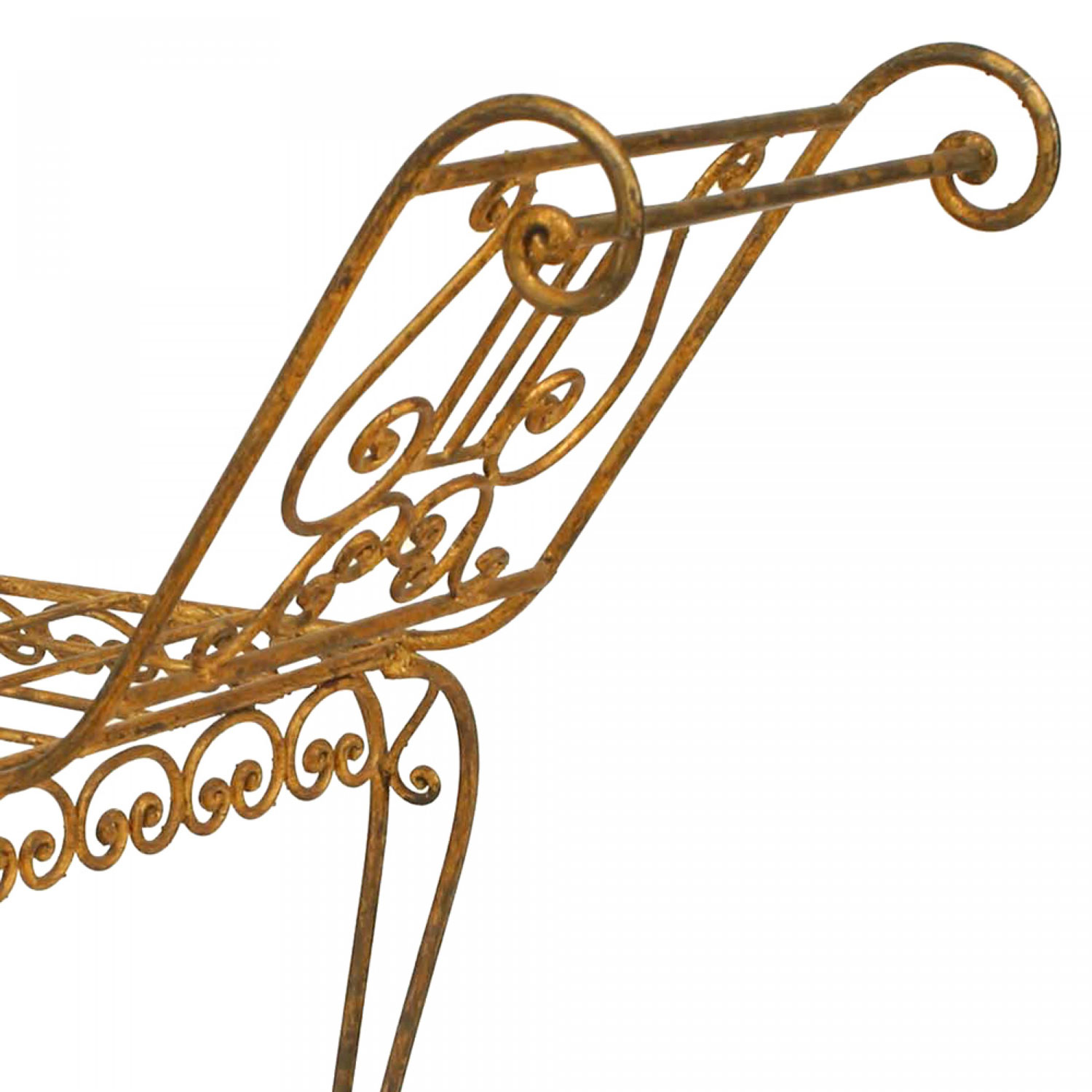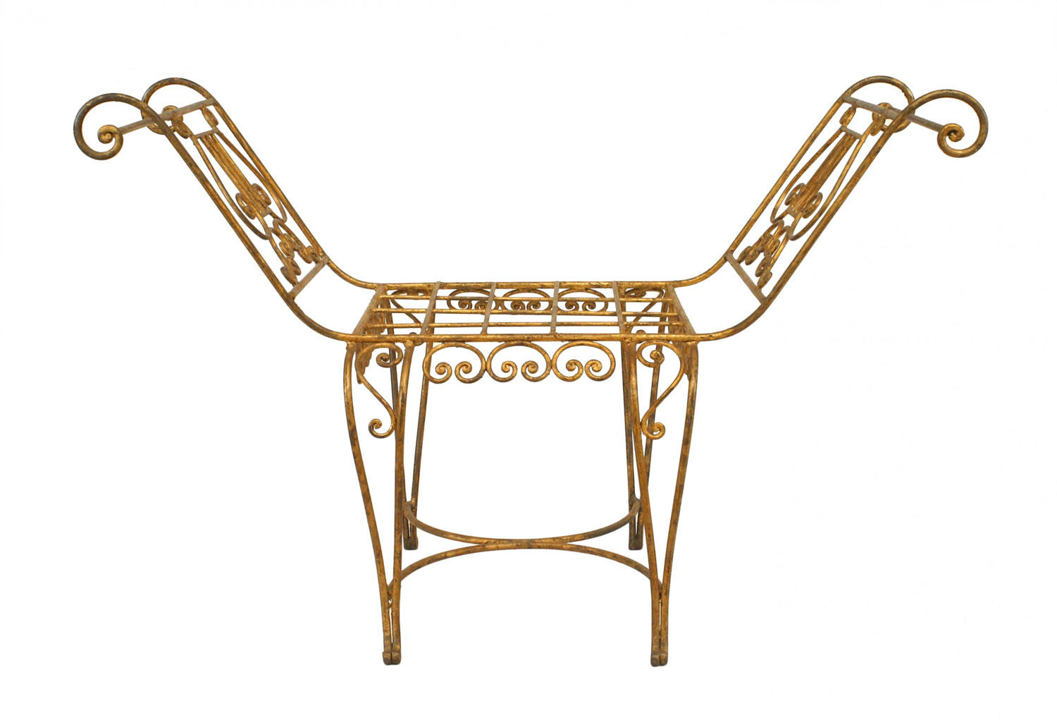French Art Moderne (1940s) gilt wrought iron window bench with scrolling legs and arms with lyre form
