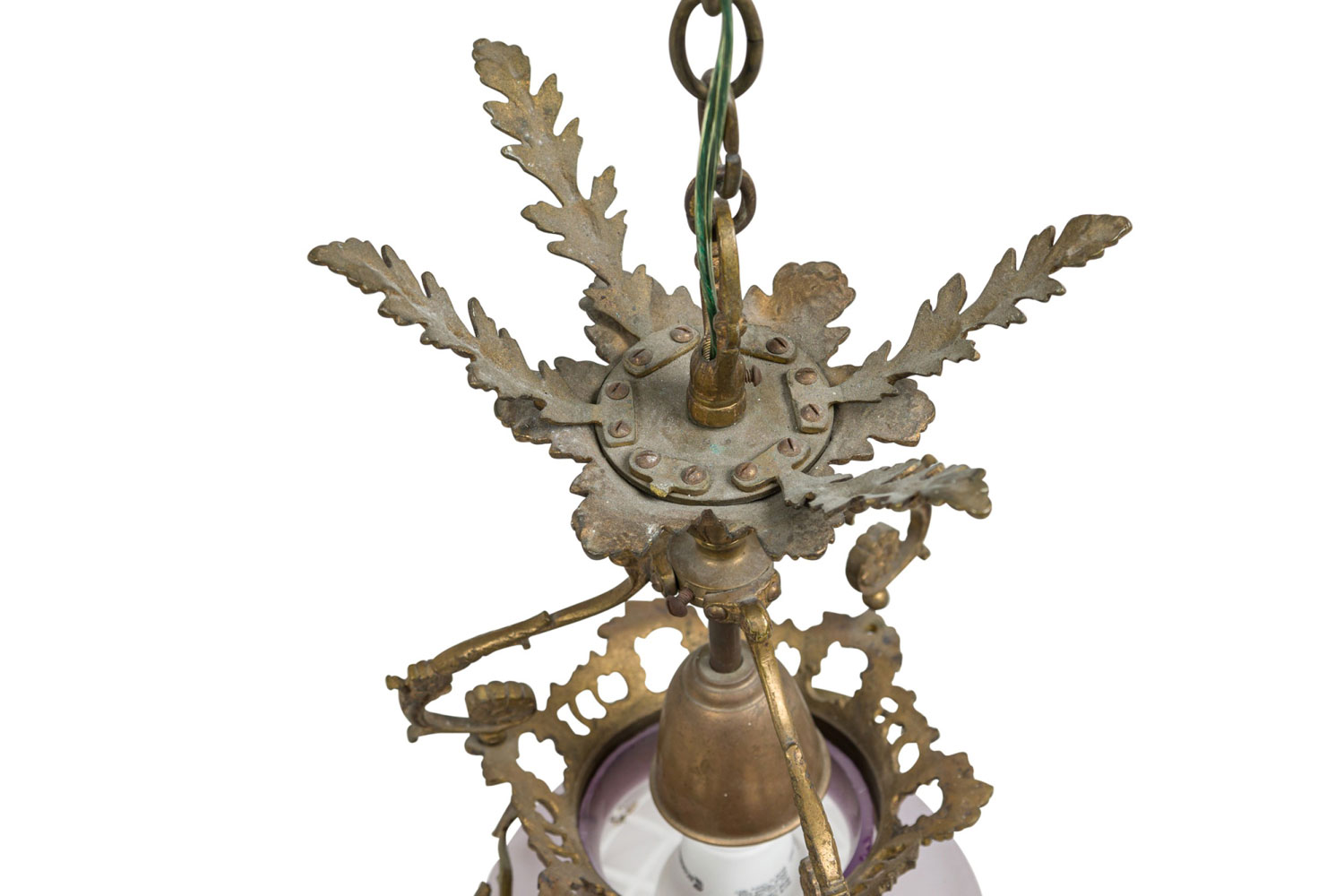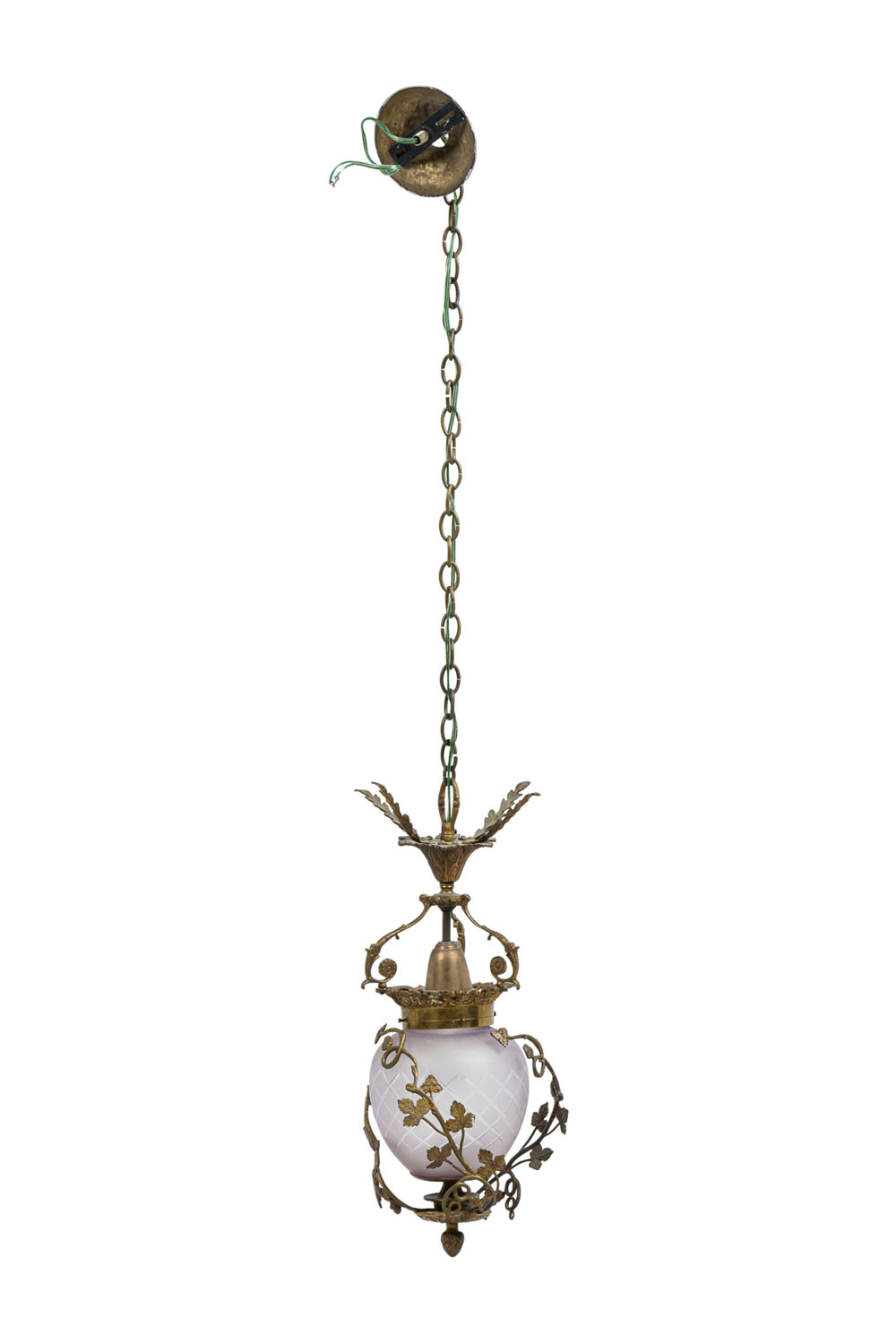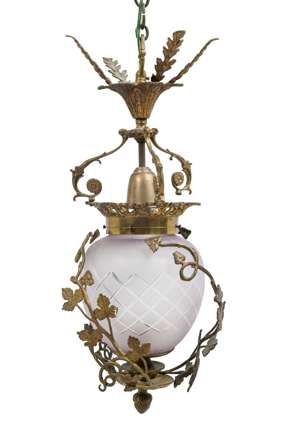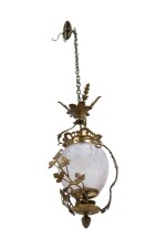 French Art Nouveau Style (1st half 20th Century) Brass lantern fixture with acanthus leaves embracing a centered frosted glass shade ending with a finial and the canopy bears four pronged elongated leaves suspended with an extended chain