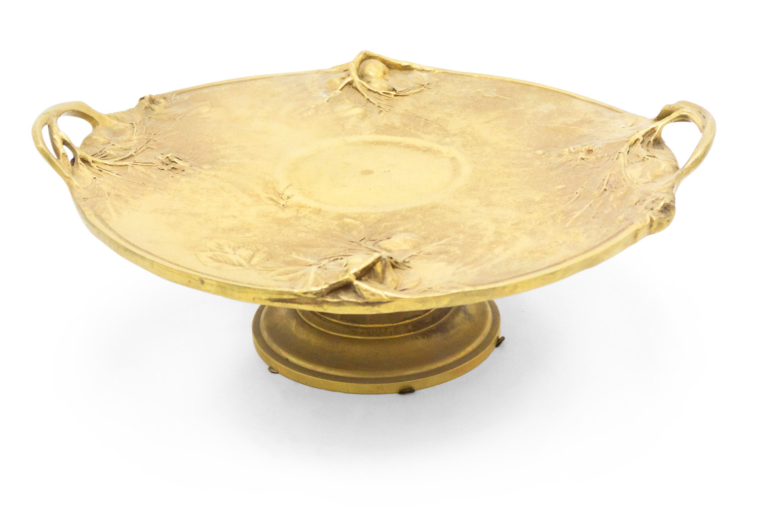 French Art Nouveau round bronze dore compote with twig design handles and floral relief on pedestal base (signed ALBERT CHEUREL SILOS)