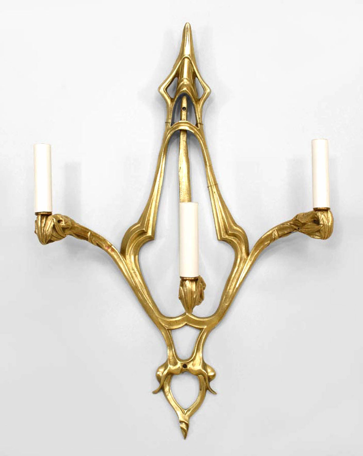 PAIR of French Art Nouveau bronze dore wall sconces with three arms and whiplash design.