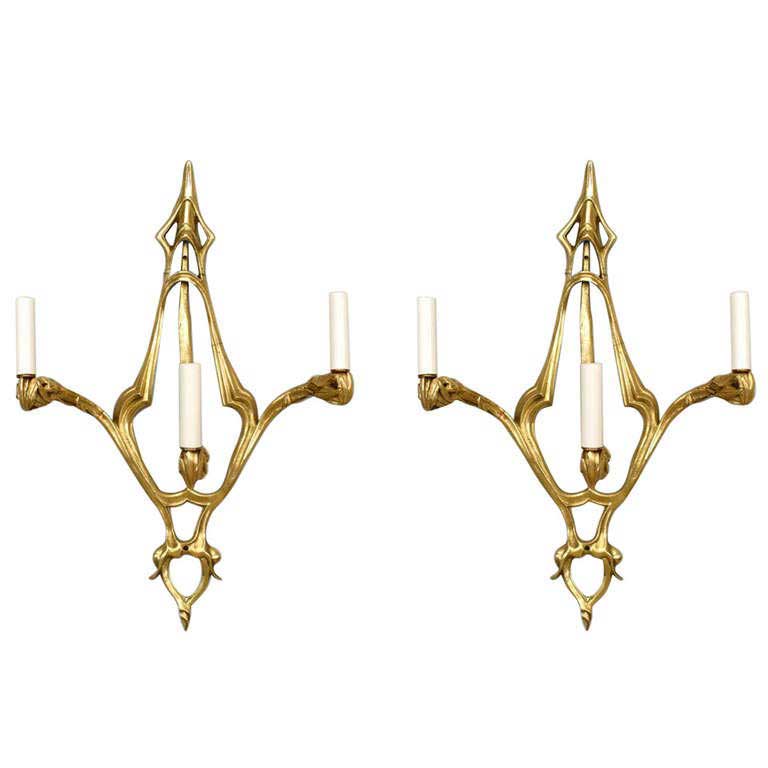 Pair of French Art Nouveau Bronze Dore Wall Sconces