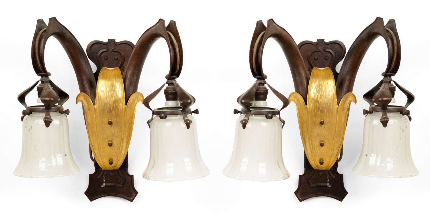 4 French Art Nouveau copper wall sconces with two arms and gilt fleur de lis front panels. (PRICED EACH).