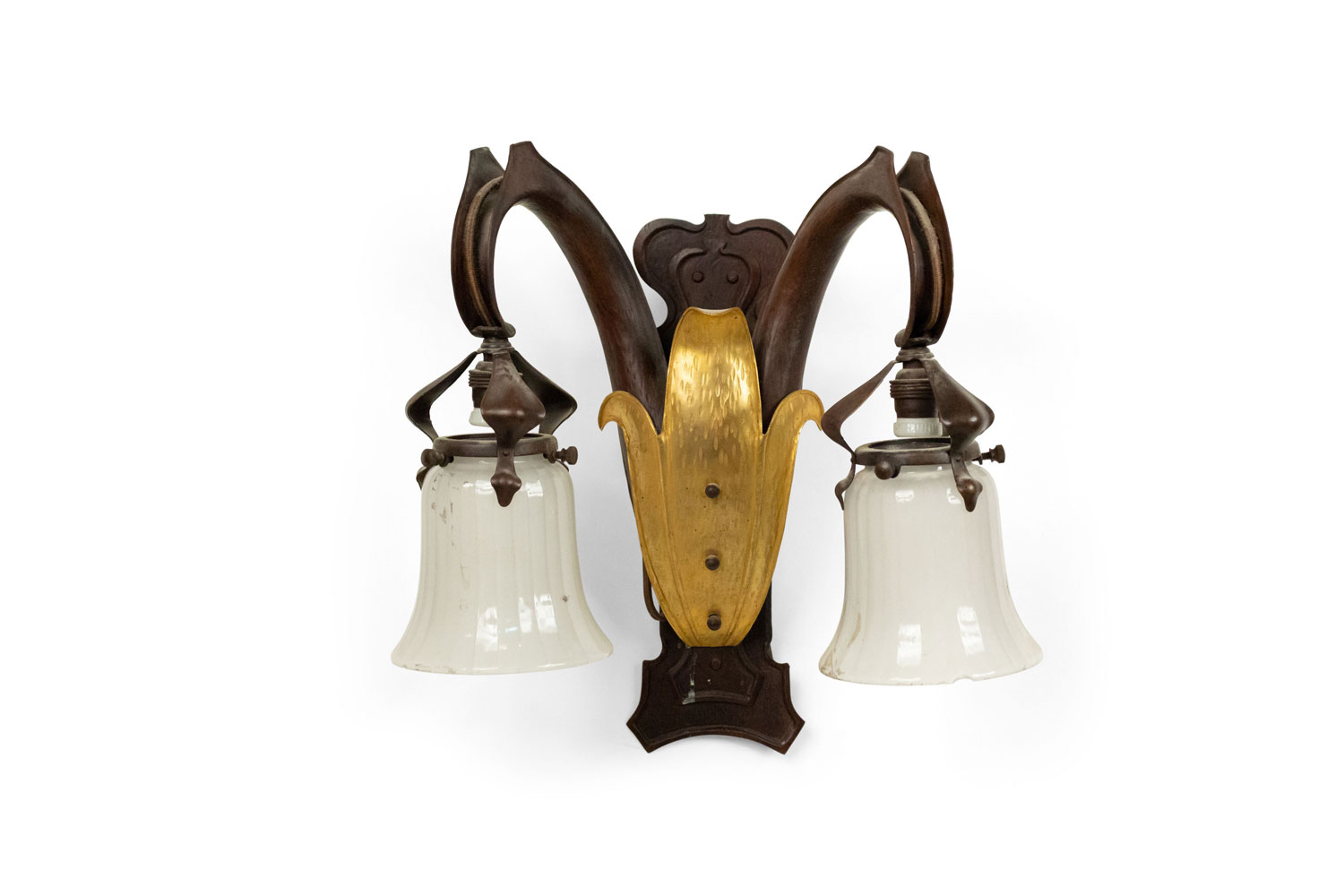 4 French Art Nouveau copper wall sconces with two arms and gilt fleur de lis front panels. (PRICED EACH)