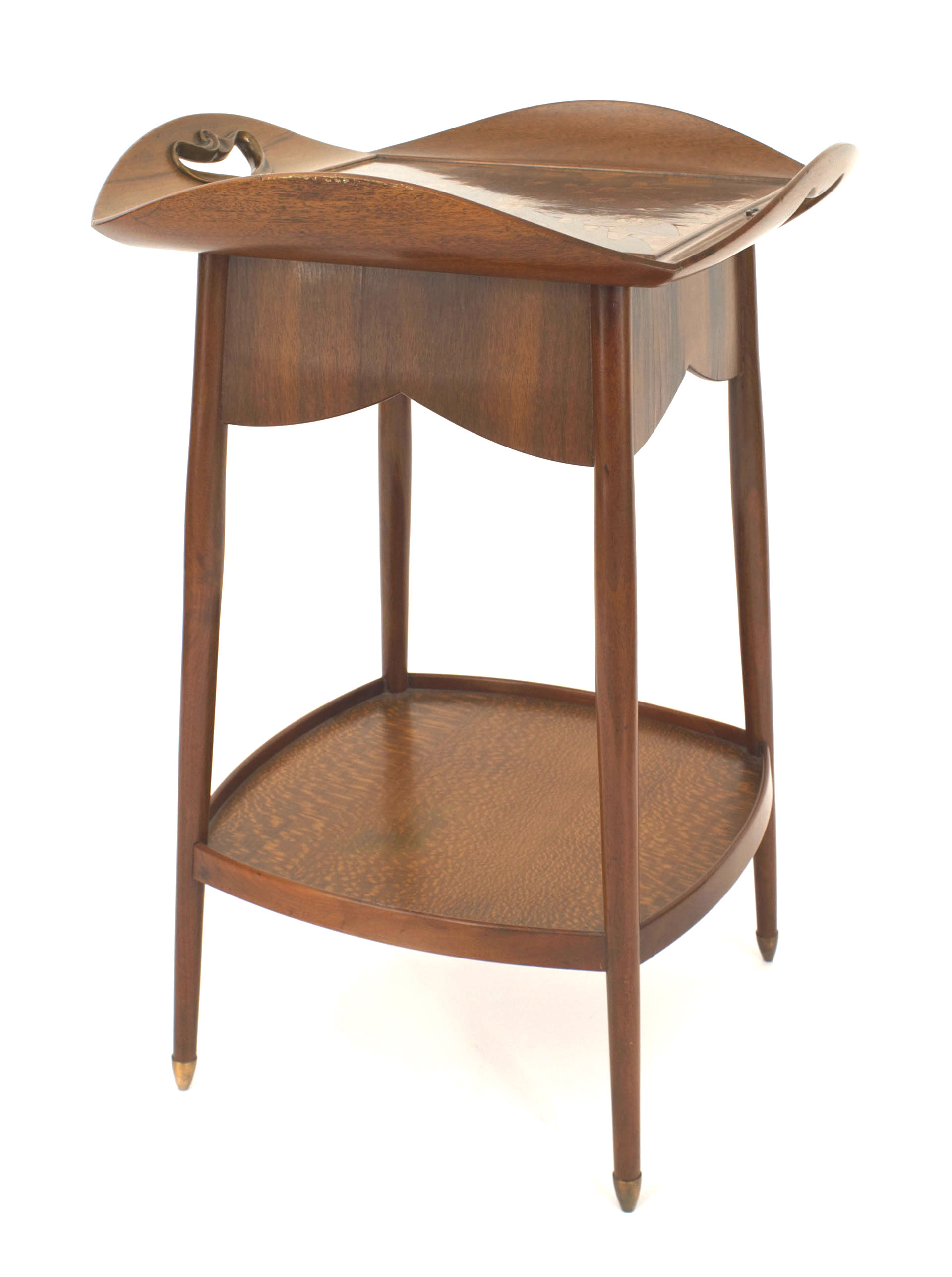 French Art Nouveau walnut square end table having a floral inlaid tray top with open copper handles and curved raised sides with a burl maple bottom shelf. (Attributed to MAJORELLE)